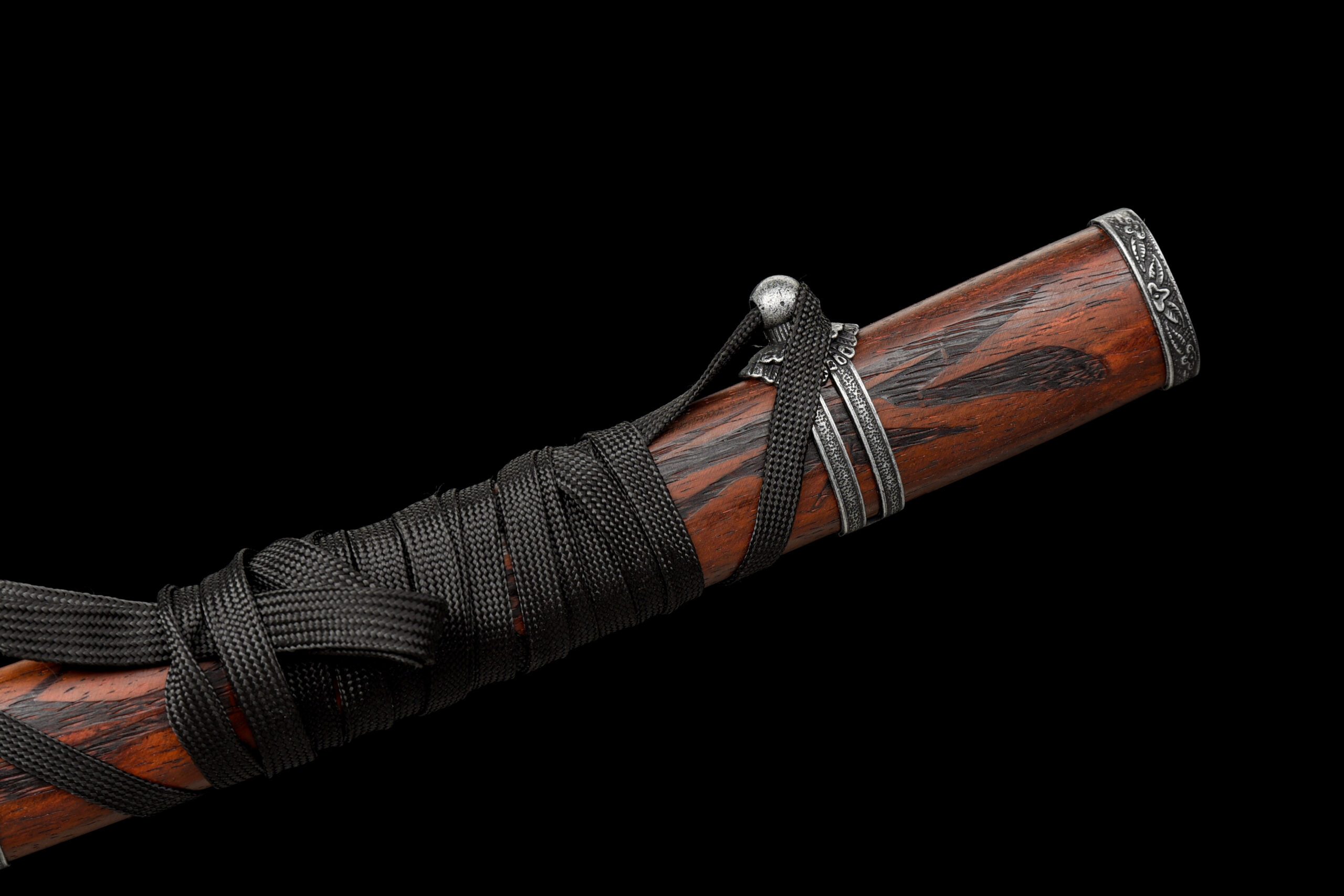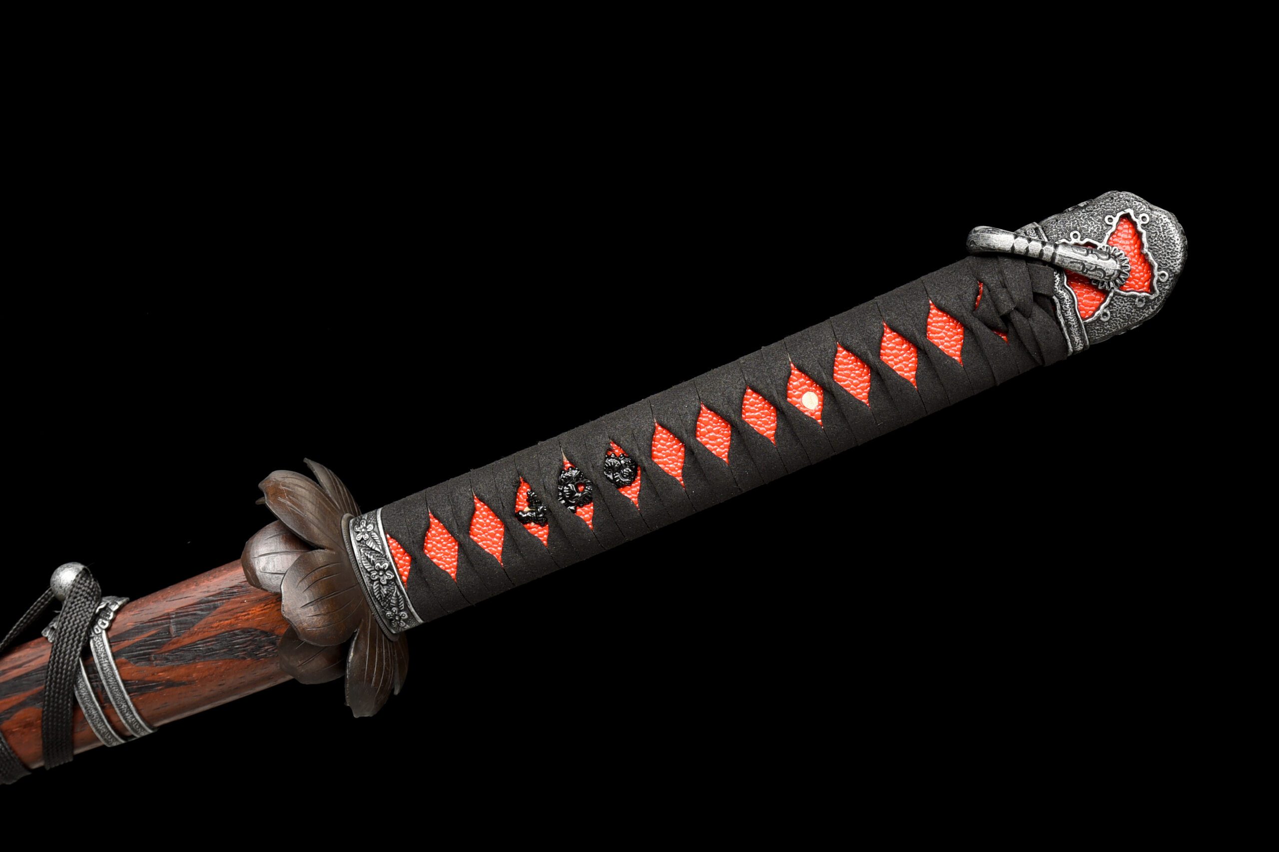 - Fourreau (Saya 鞘) : Fourreau en bois de palissandre avec Kojiri et Koiguchi en alliage argenté gravé de fleurs.