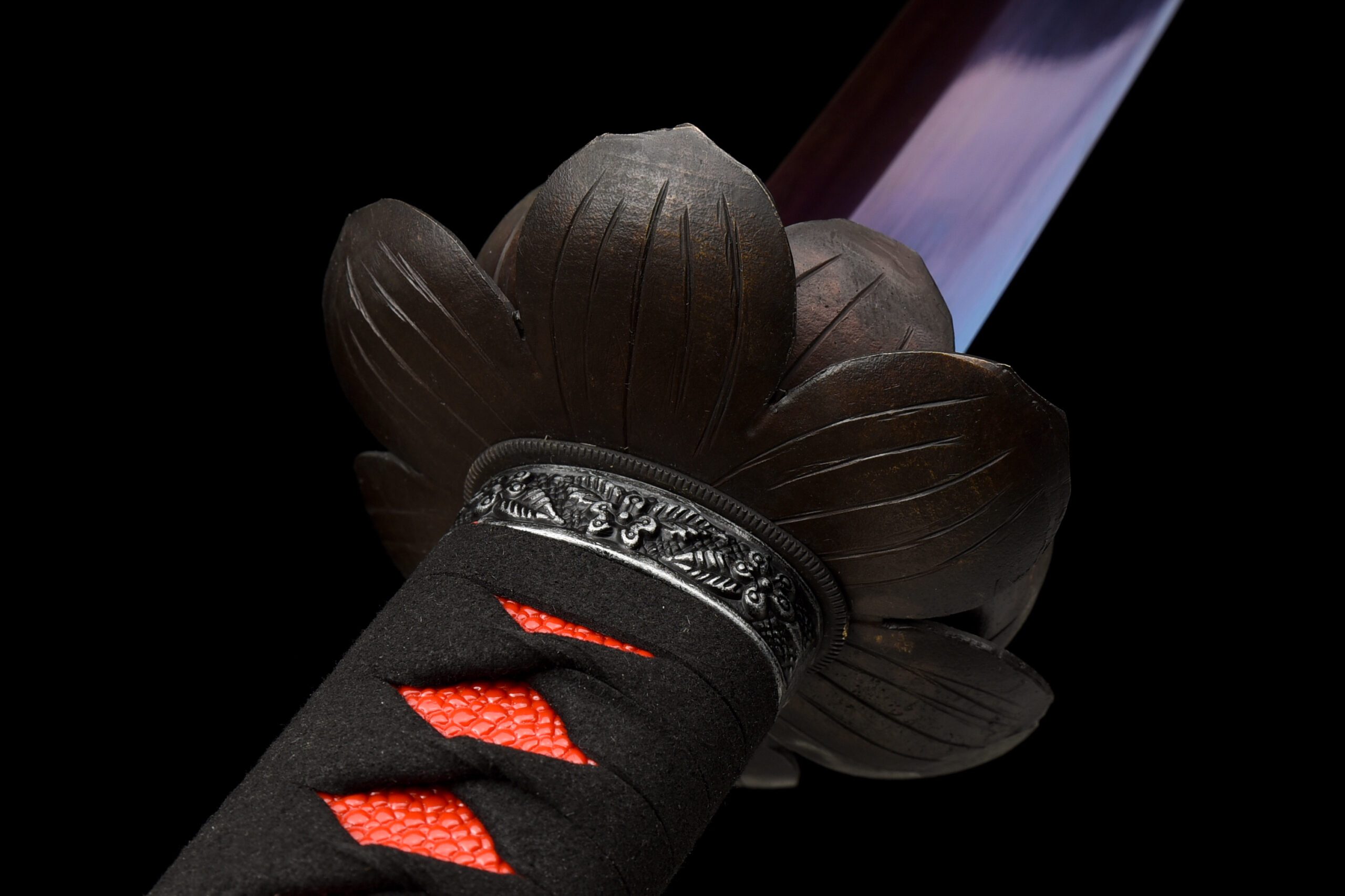 - Garde (Tsuba 鍔) : Alliage de cuivre en forme de lotus en relief.