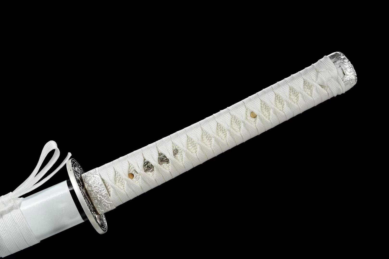 La lame en acier T10 arbore une finition naturelle qui révèle la beauté brute du métal forgé, tandis que la garde (Tsuba) ronde en alliage argenté présente des gravures d’animaux qui rendent hommage au bestiaire mythologique. Le manche (Tsuka) combine harmonieusement la fausse peau de raie blanche avec un tressage (Tsuka-ITO) blanc en motif losange, créant une prise ferme et élégante. Les Menuki argentés ajoutent des accents discrets, tandis que le Fuchi et le Kashira, tous deux gravés de symboles de vents et d’océans, évoquent les forces naturelles que maîtrise le Tigre Blanc. Le fourreau (Saya) constitue l’élément le plus spectaculaire avec son laqué blanc granuleux orné de tigres peints, encadré par des extrémités noires qui créent un contraste saisissant.