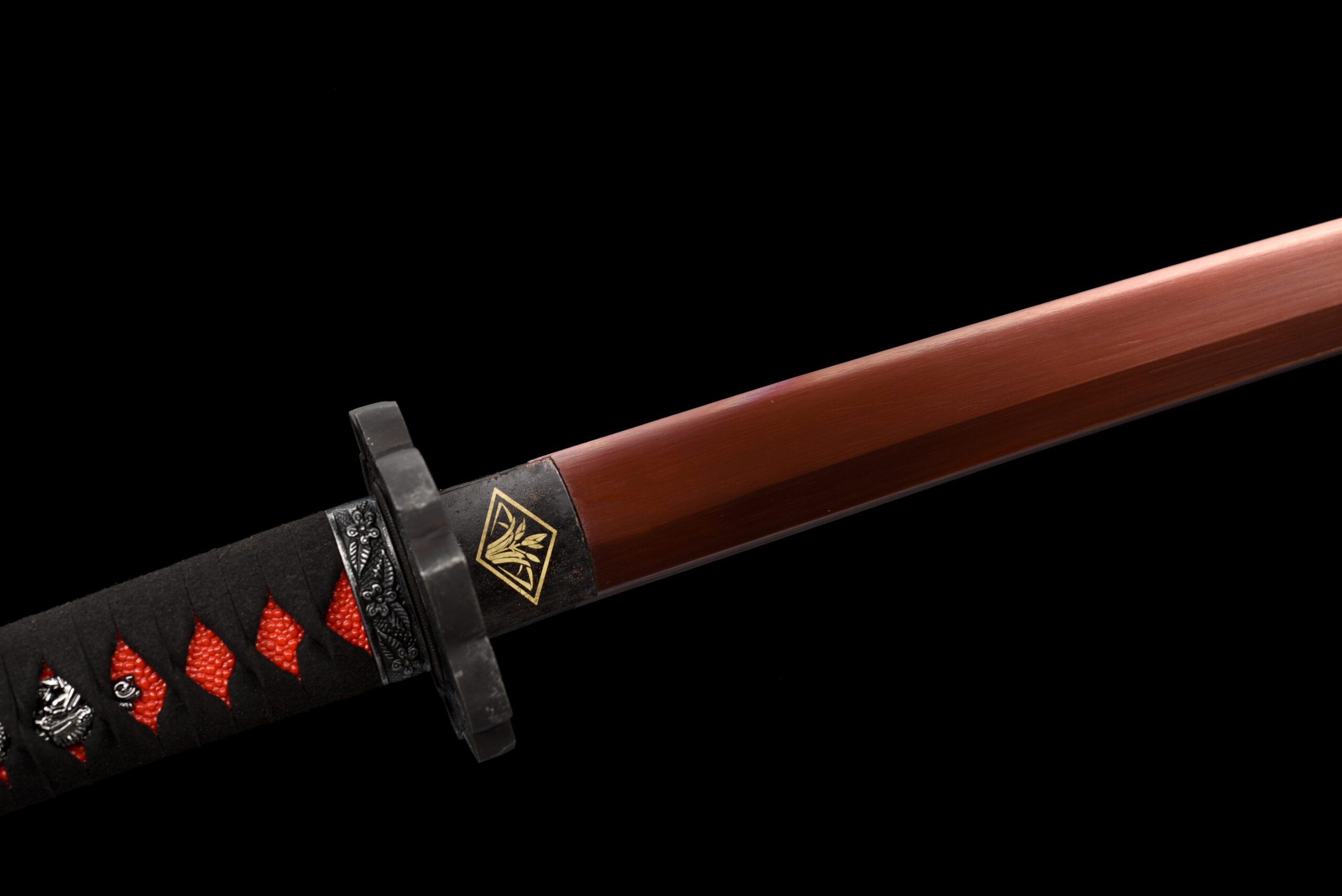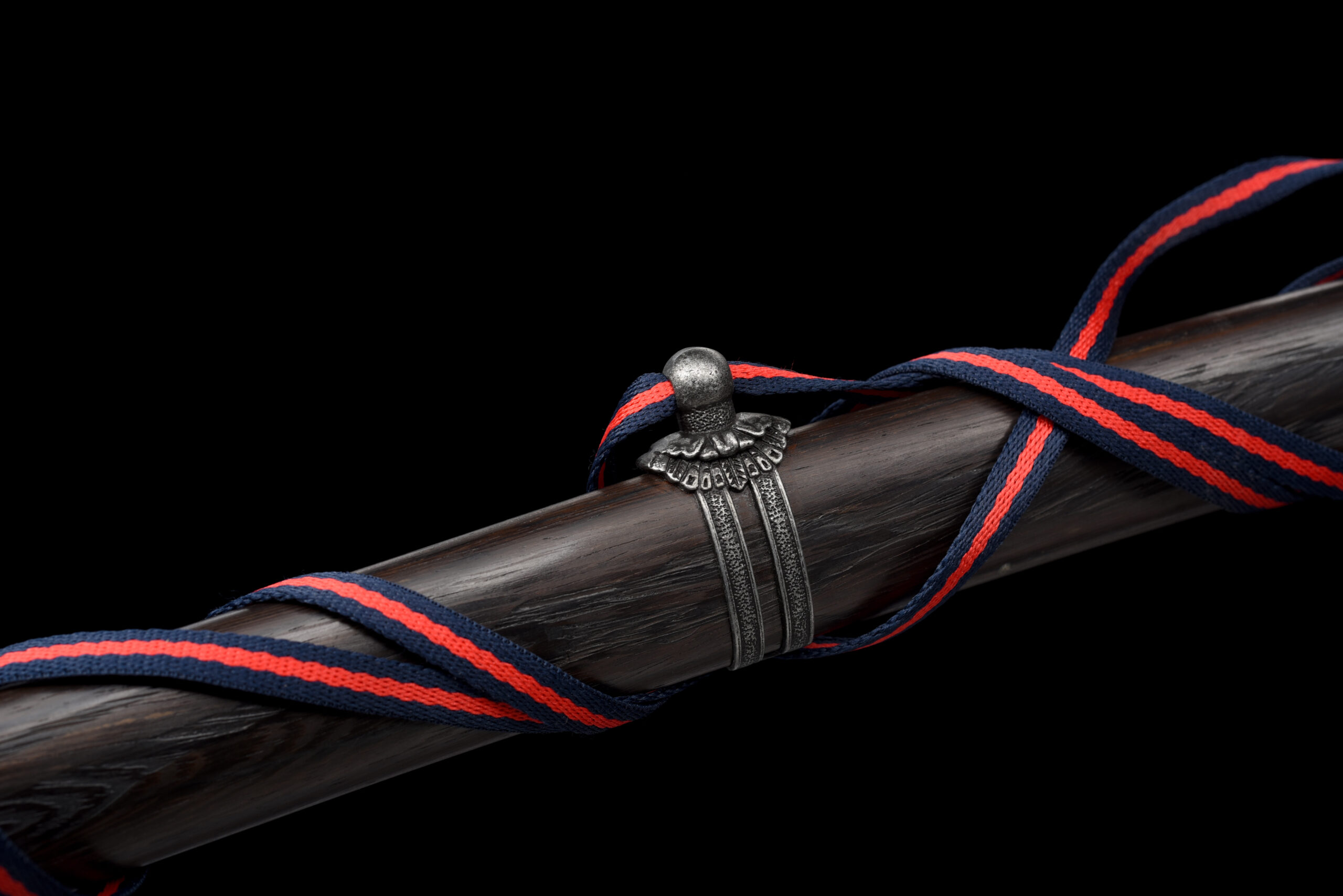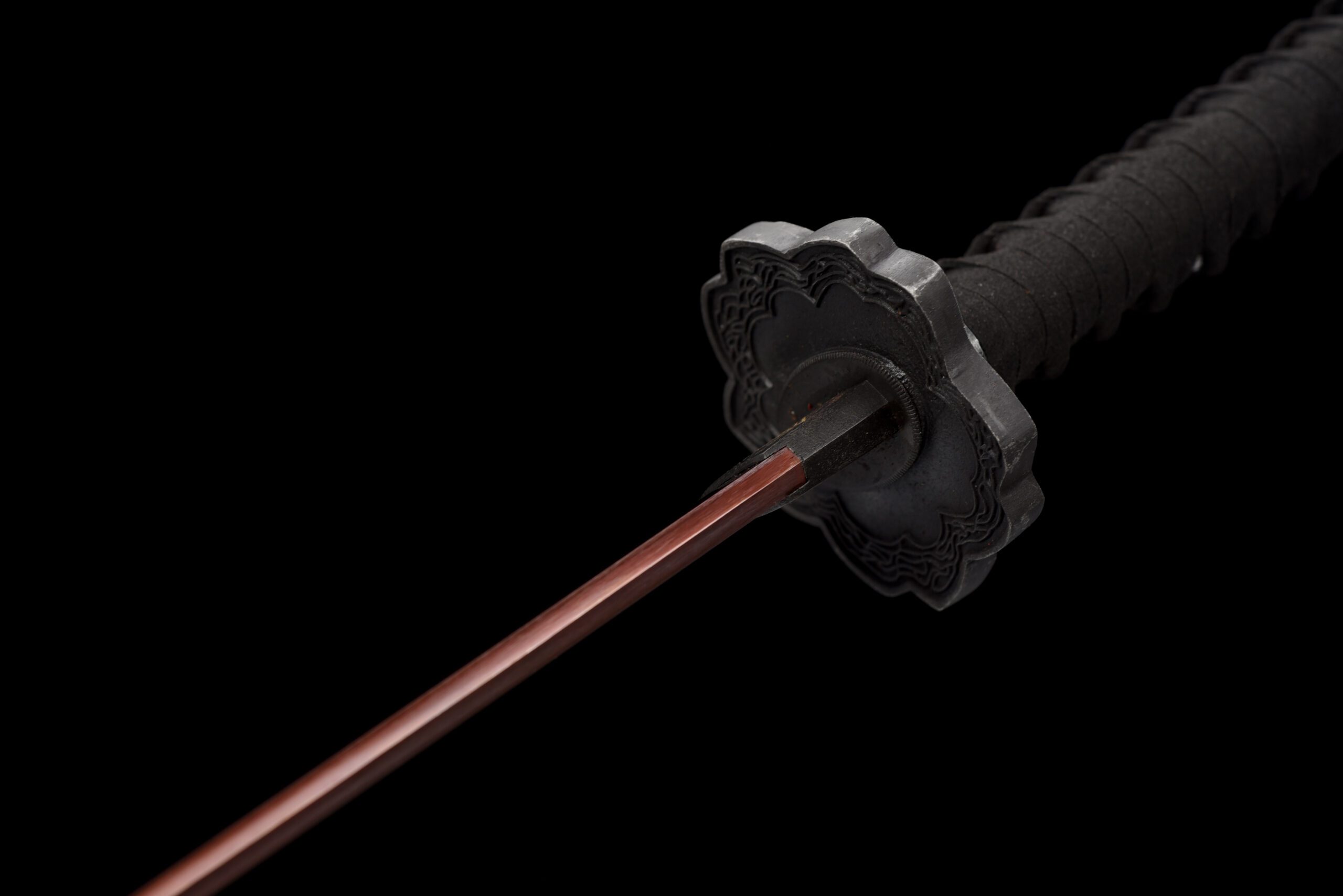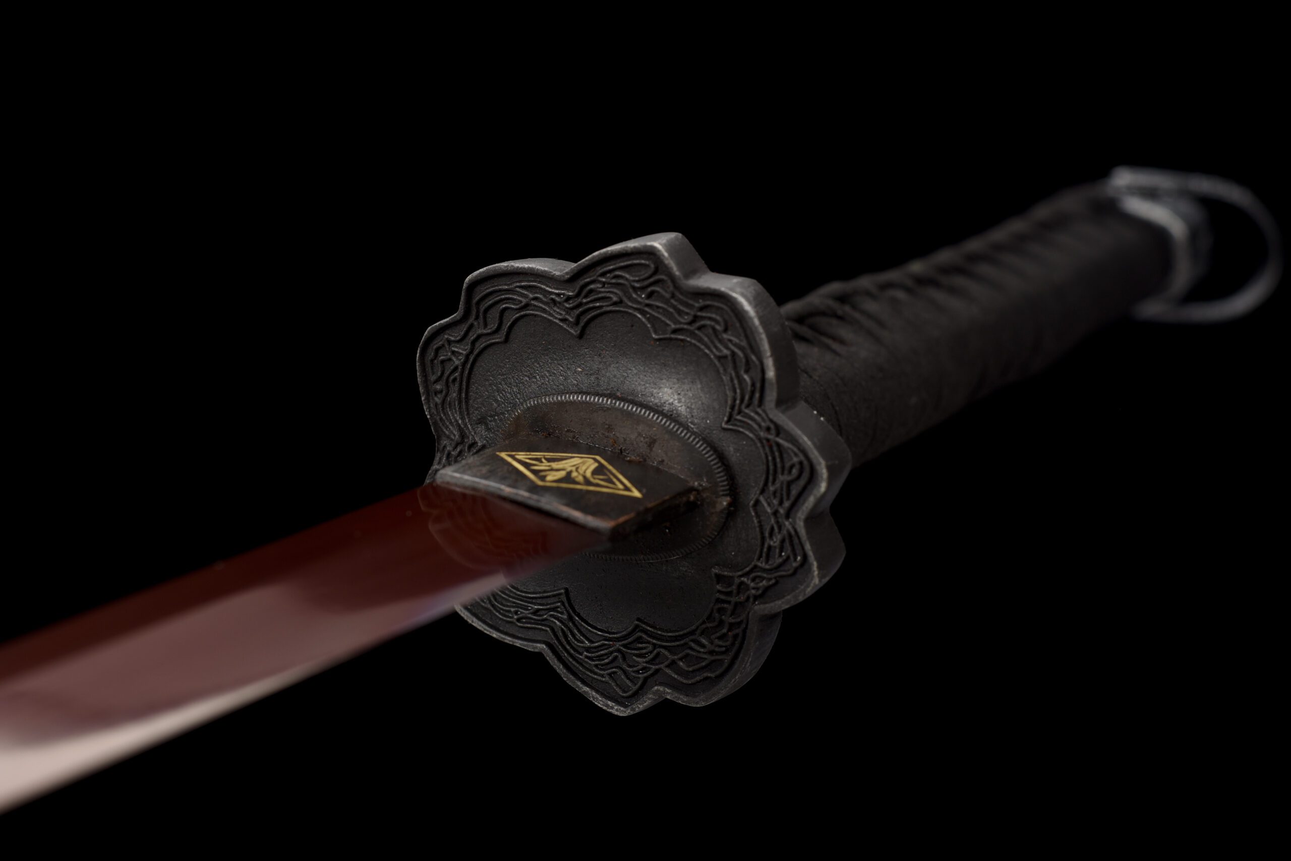 La lame en acier au manganèse se distingue par sa couleur rouge sang saisissante, évoquant les batailles sanglantes et la nature mortelle de cette arme légendaire. La tsuba en alliage prend la forme délicate d’un lotus, symbole de renaissance et de pureté spirituelle dans la philosophie bouddhiste, contrastant avec la nature destructrice de l’épée. Le manche en bois de palissandre noble s’orne de fausse peau de raie noire, tandis que le tressage tsuka-ito noir forme des motifs en losange qui offrent une prise ferme et élégante. Les menuki discrets et le kashira en alliage argenté complètent harmonieusement l’ensemble. Le fourreau en bois de palissandre vieilli arbore des extrémités en alliage argenté finement gravées de motifs floraux, créant un contraste saisissant avec les bélières de monture militaire du sageo.