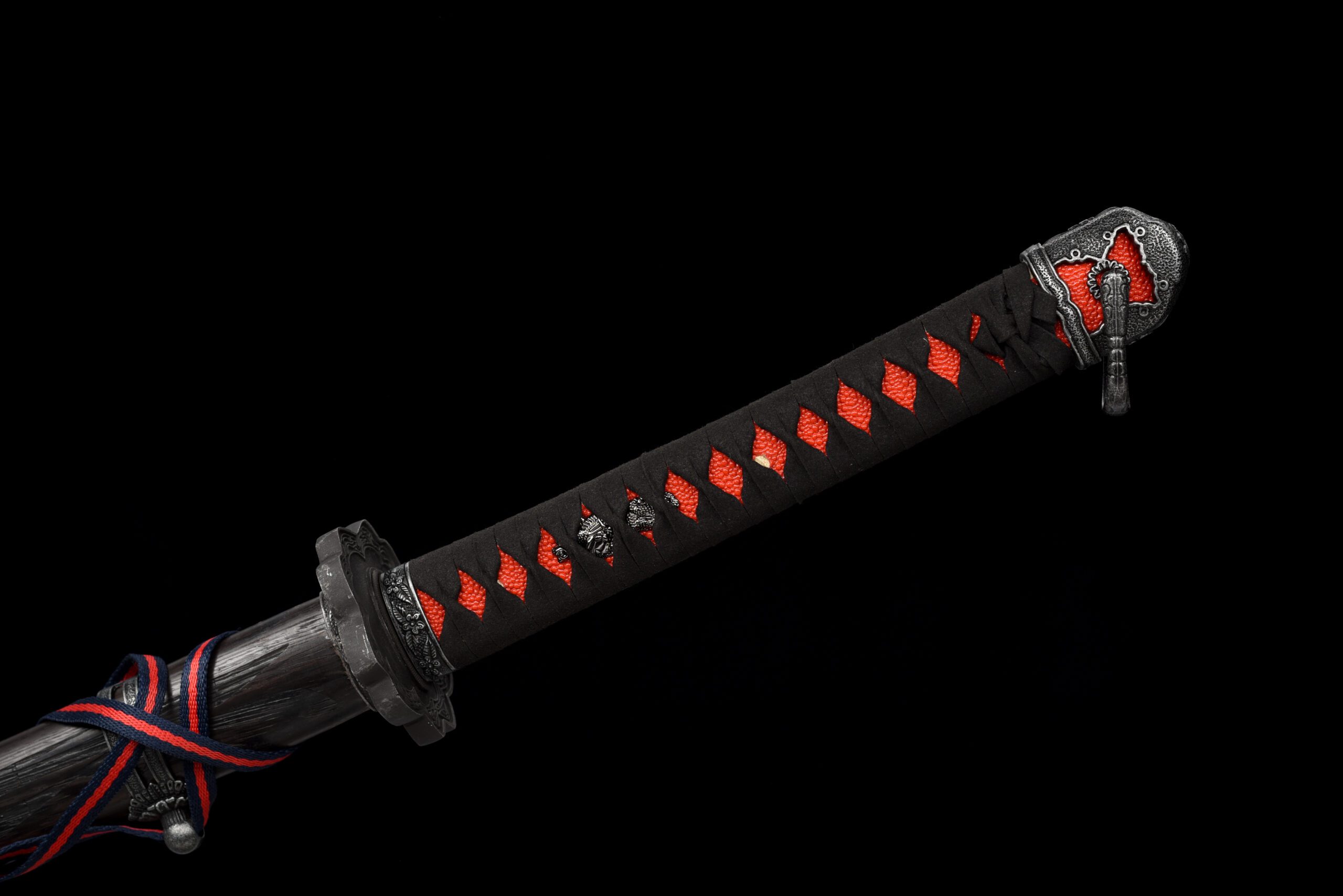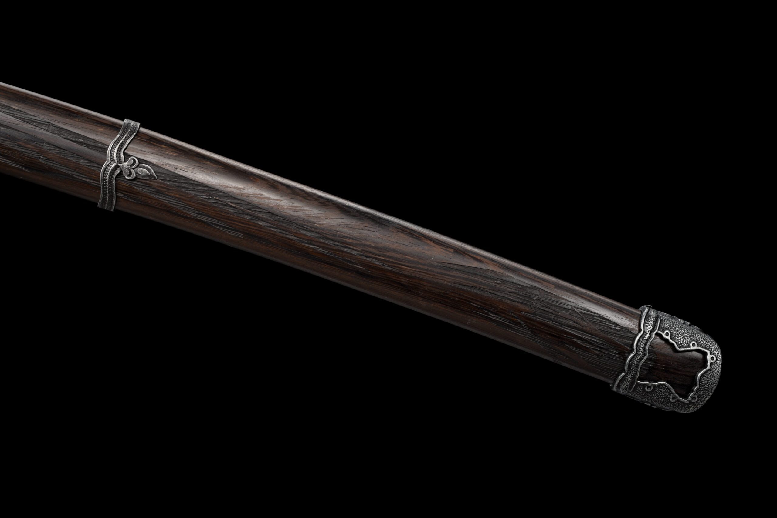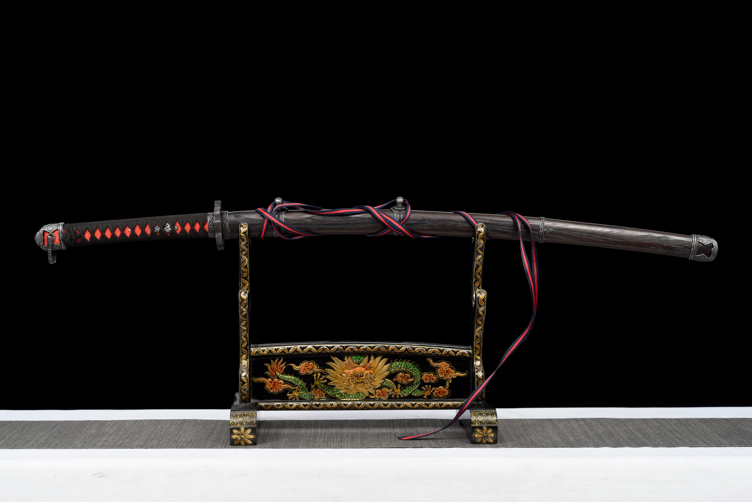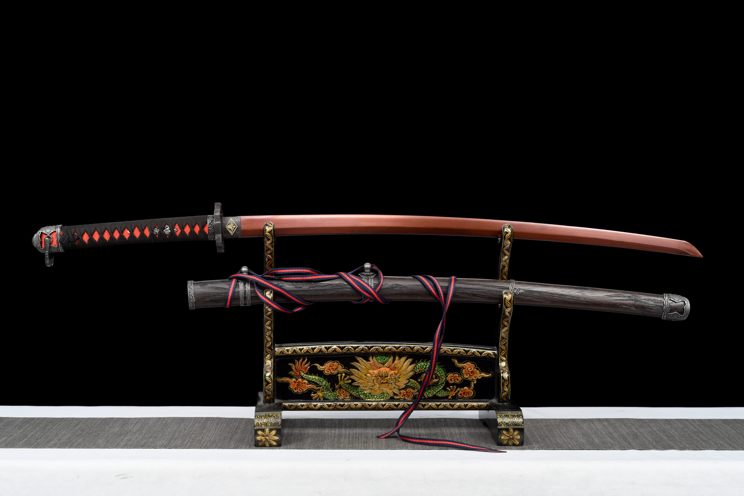 La lame en acier au manganèse se distingue par sa couleur rouge sang saisissante, évoquant les batailles sanglantes et la nature mortelle de cette arme légendaire. La tsuba en alliage prend la forme délicate d’un lotus, symbole de renaissance et de pureté spirituelle dans la philosophie bouddhiste, contrastant avec la nature destructrice de l’épée. Le manche en bois de palissandre noble s’orne de fausse peau de raie noire, tandis que le tressage tsuka-ito noir forme des motifs en losange qui offrent une prise ferme et élégante. Les menuki discrets et le kashira en alliage argenté complètent harmonieusement l’ensemble. Le fourreau en bois de palissandre vieilli arbore des extrémités en alliage argenté finement gravées de motifs floraux, créant un contraste saisissant avec les bélières de monture militaire du sageo.