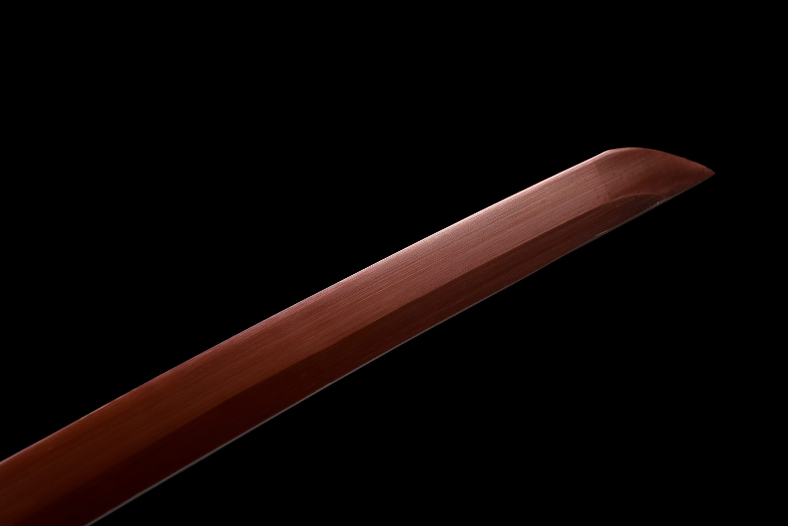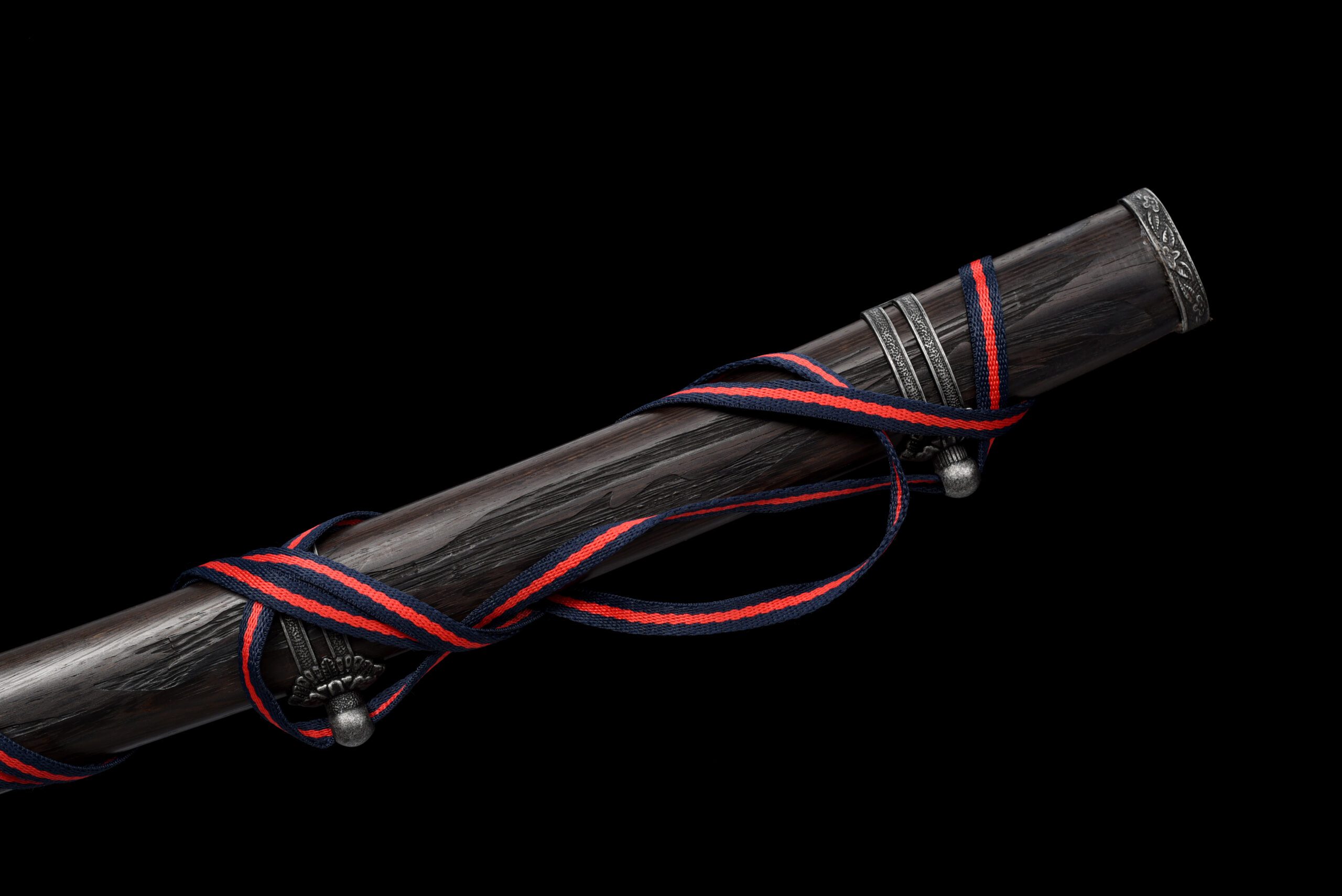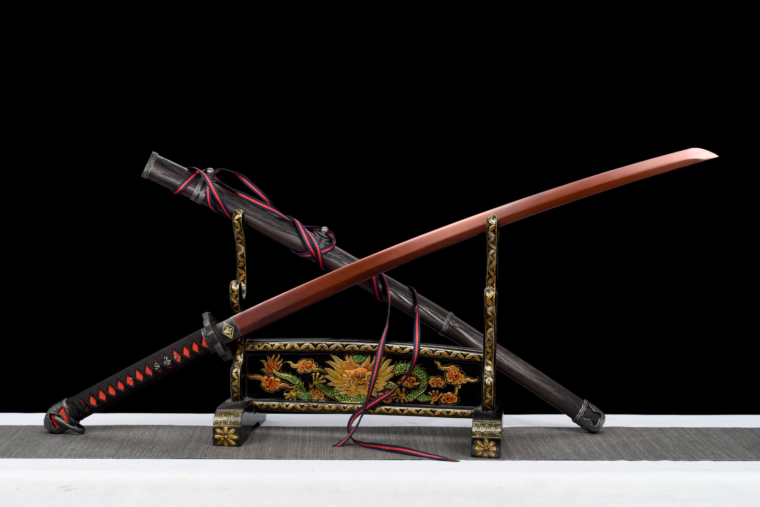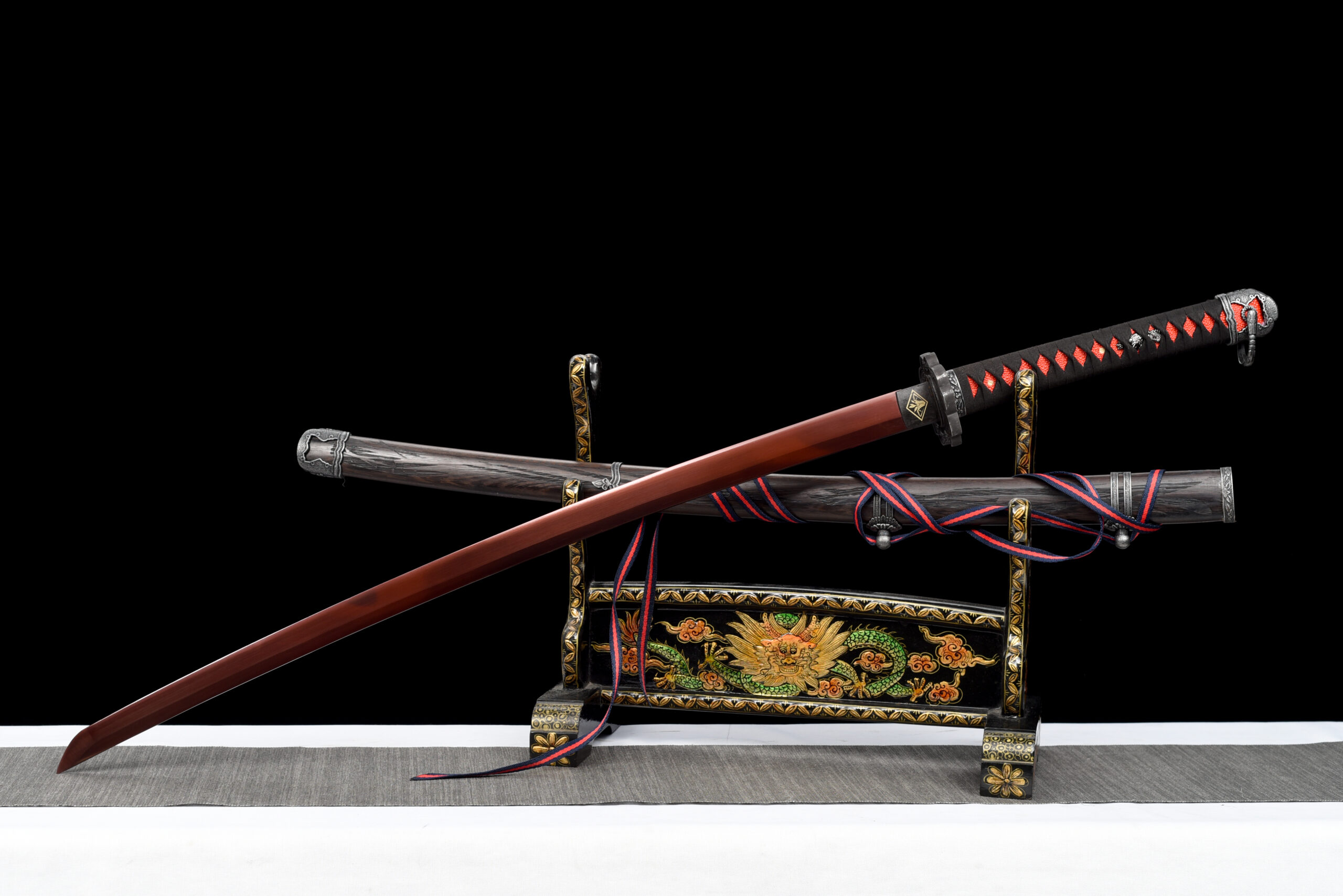 La lame en acier au manganèse se distingue par sa couleur rouge sang saisissante, évoquant les batailles sanglantes et la nature mortelle de cette arme légendaire. La tsuba en alliage prend la forme délicate d’un lotus, symbole de renaissance et de pureté spirituelle dans la philosophie bouddhiste, contrastant avec la nature destructrice de l’épée. Le manche en bois de palissandre noble s’orne de fausse peau de raie noire, tandis que le tressage tsuka-ito noir forme des motifs en losange qui offrent une prise ferme et élégante. Les menuki discrets et le kashira en alliage argenté complètent harmonieusement l’ensemble. Le fourreau en bois de palissandre vieilli arbore des extrémités en alliage argenté finement gravées de motifs floraux, créant un contraste saisissant avec les bélières de monture militaire du sageo.