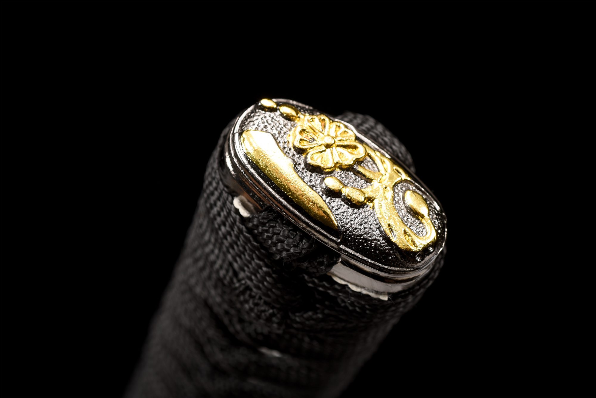 - Garde (Tsuba 鍔) : Forme de croix arrondie dorée avec chrysanthèmes argentés gravés.