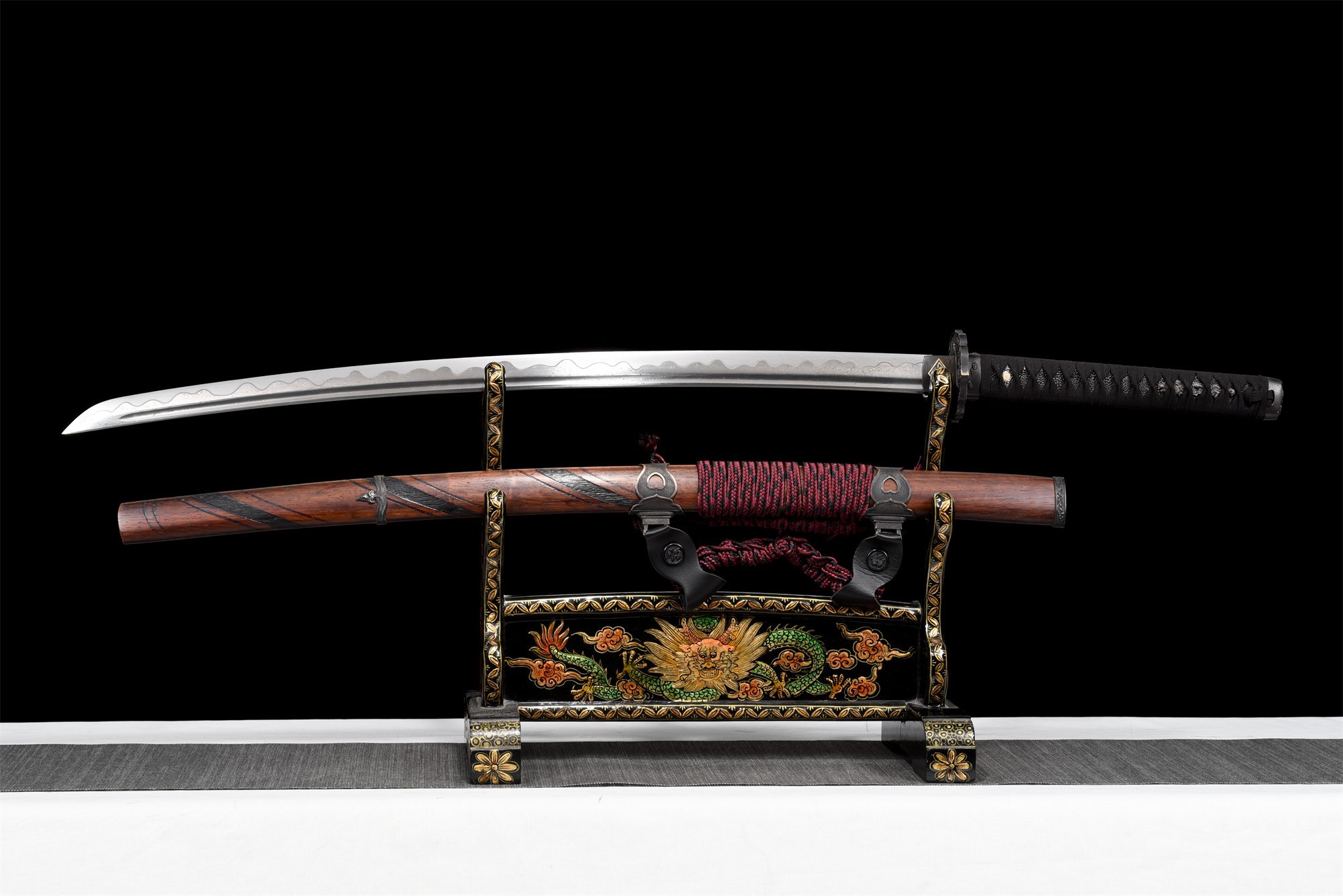 La lame en acier Damas dévoile ses motifs serpentins naturels qui dansent le long du tranchant, tandis que le Hamon trace une ligne de démarcation subtile entre les zones de trempe. La garde Tsuba en cuivre noir adopte la forme délicate d’une fleur de lotus, symbole de pureté et de renaissance dans la culture asiatique. Le manche combine la noblesse de la peau de raie authentique avec la chaleur du bois de palissandre, enveloppé d’un Tsuka-ITO noir aux motifs losange qui offrent une prise ferme et esthétique. Les Menuki représentent des dragons noirs, gardiens mythiques de la force et de la sagesse. Le fourreau en bois de palissandre s’orne d’un Koiguchi noir gravé en alliage, complété par un Sageo aux teintes rouge et noir militaire qui évoque la discipline martiale.
