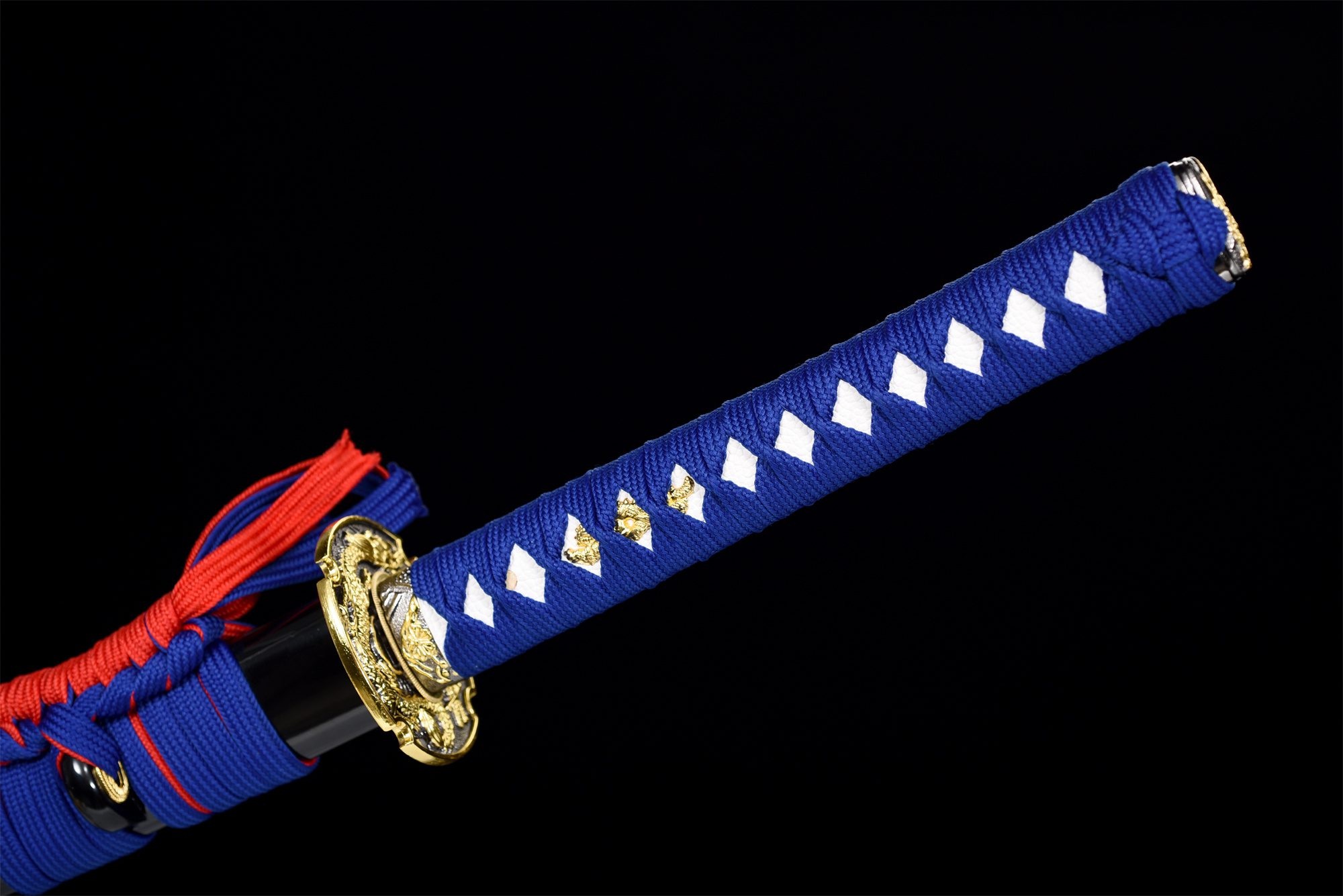 La lame en acier au manganèse présente une teinte bleue rostie unique qui évoque les écailles du dragon légendaire, tandis que le hamon midare notare dessine des vagues irrégulières rappelant les nuages où réside Seiryū. La tsuba en cuivre arrondie arbore un motif de croix orné d’un dragon doré, créant un contraste saisissant avec la lame sombre. Le manche recouvert de fausse peau de raie blanche offre une prise ferme, sur lequel le tressage bleu (tsuka-ito) forme des losanges réguliers. Les menuki dorés représentent fidèlement le dragon céleste, tandis que les fuchi et kashira en cuivre dévoilent des motifs floraux délicats qui complètent l’esthétique raffinée. Le fourreau en bois laqué noir s’orne d’un dragon doré majestueux, accompagné d’un sageo bicolore bleu et rouge qui rappelle les couleurs du ciel à l’aube.