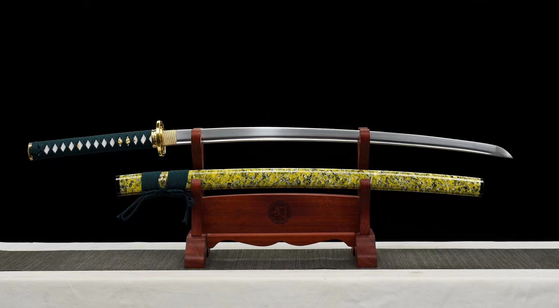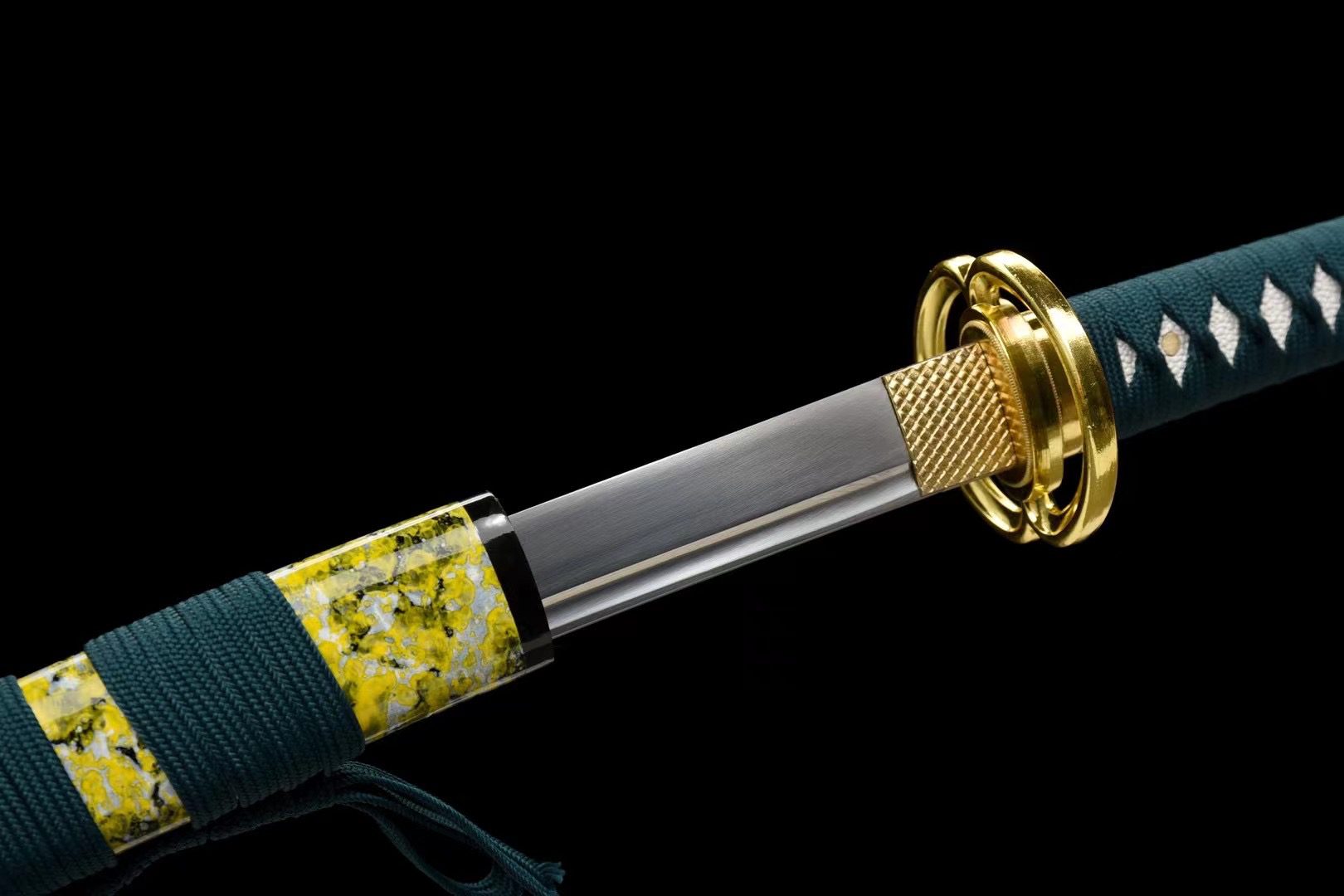 La lame en acier T10 présente une finition soignée, tandis que le bo-hi allège la structure tout en produisant le son caractéristique lors des mouvements. La garde dorée circulaire à deux anneaux offre une protection élégante, complétée par des ornements fuchi et kashira en alliage doré gravés de motifs floraux délicats. Le manche combine la fausse peau de raie blanche avec un tressage vert en losange, créant un contraste harmonieux. Les menuki représentent un dragon doré, symbole de puissance et de sagesse. Le fourreau se distingue par sa laque tricolore jaune, blanc et noir qui évoque les pétales de fleurs, avec des extrémités noires qui encadrent cette composition artistique. Le sageo vert complète cette palette chromatique naturelle.