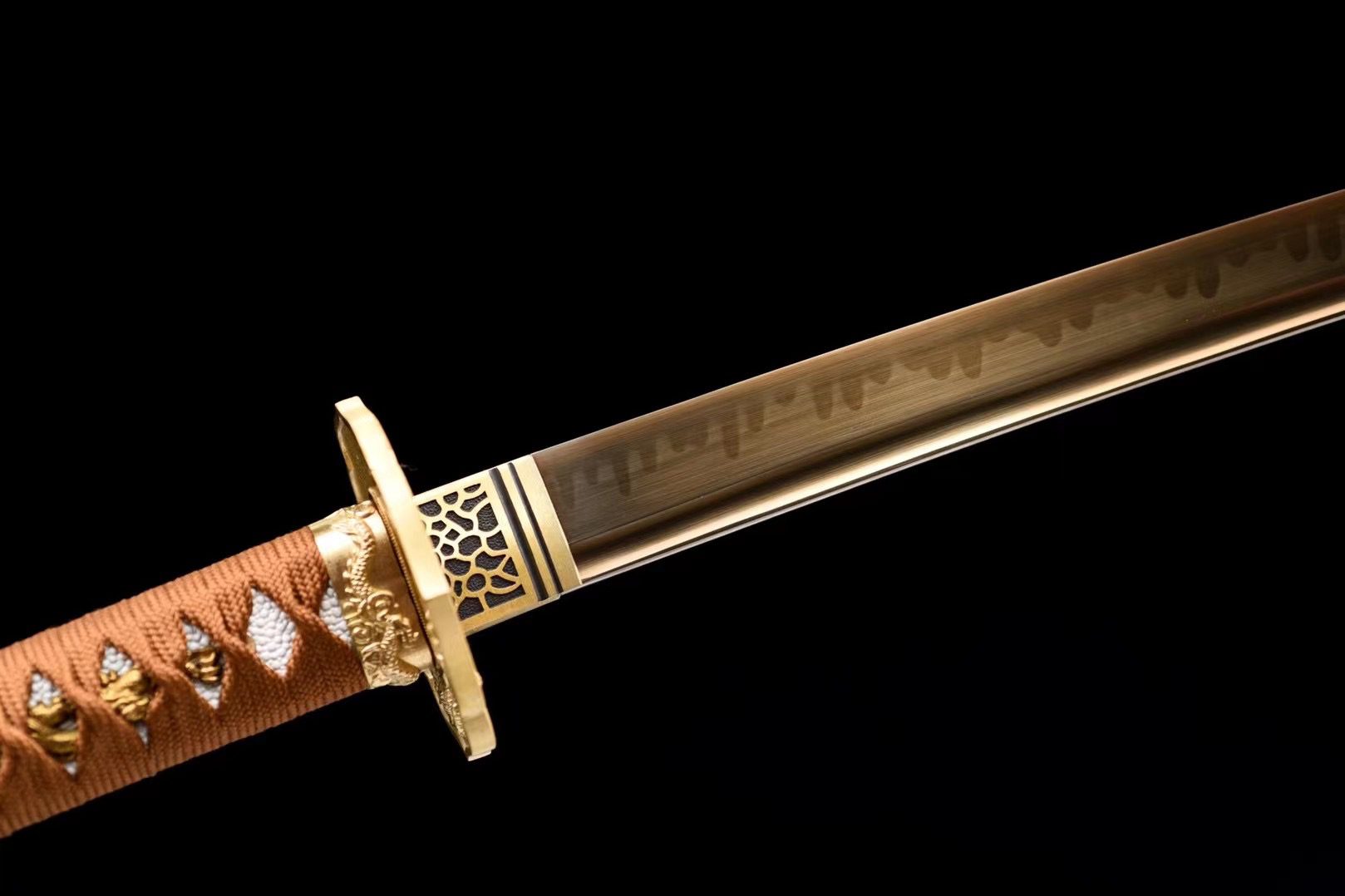 La lame en acier T10 du Katana Kōkiba, arbore une teinte cuivrée exceptionnelle qui capture et reflète la lumière avec une intensité hypnotique. Le véritable hamon, obtenu par trempe différentielle, dessine une ligne ondulante qui sépare les zones de dureté différentes, créant un contraste visuel saisissant sur cette surface dorée. Le bo-hi creuse élégamment le dos de la lame, allégeant sa structure tout en produisant ce sifflement caractéristique lors des mouvements. La garde (tsuba) en alliage doré présente un dragon, motif qui se retrouve harmonieusement sur le fuchi, tandis que le kashira couronne la poignée d’une tête de dragon majestueuse. Le manche révèle la texture authentique de la peau de raie blanche (samegawa) sous un tressage marron en losanges, ponctué de menuki dorés représentant des dragons. Le fourreau surprend par sa finition transparente qui dévoile la beauté naturelle du bois brut, encadré par des extrémités noires contrastantes et un sageo bicolore noir et cuivré.