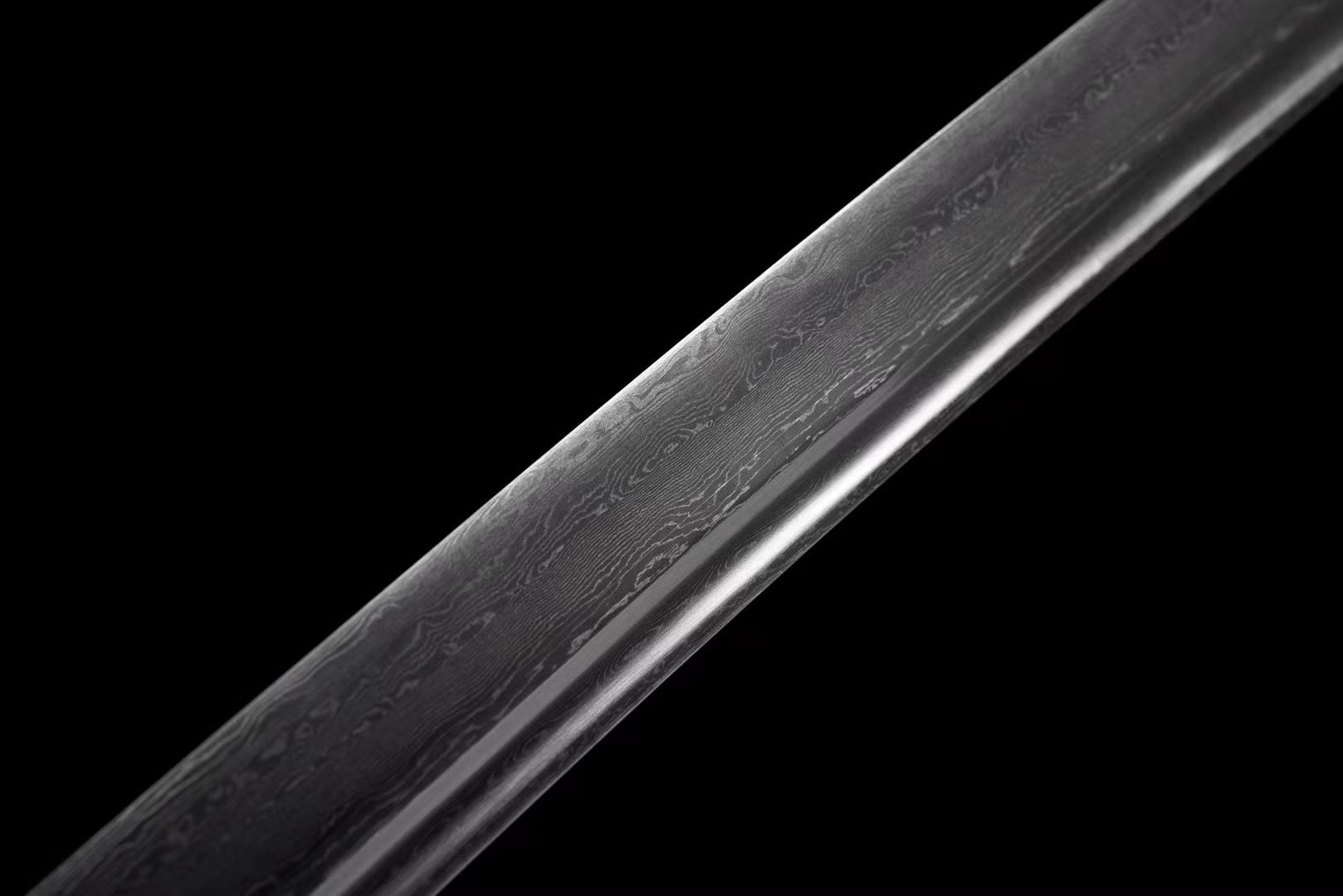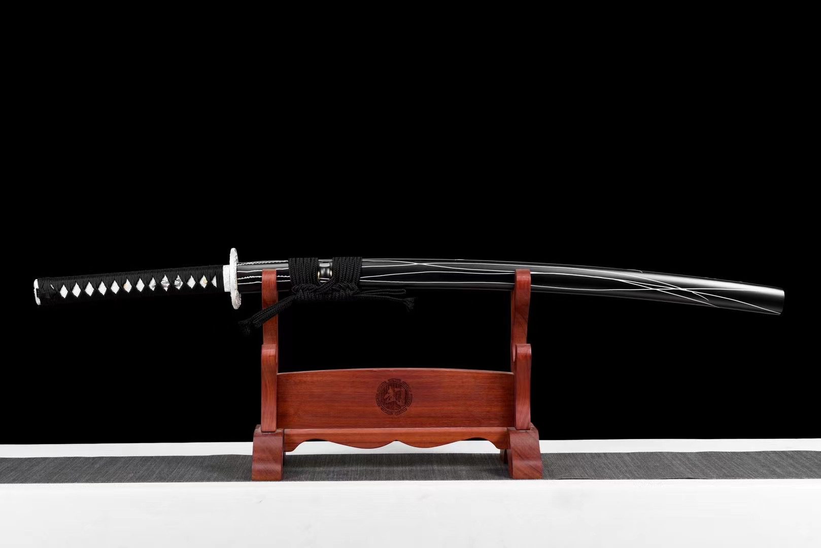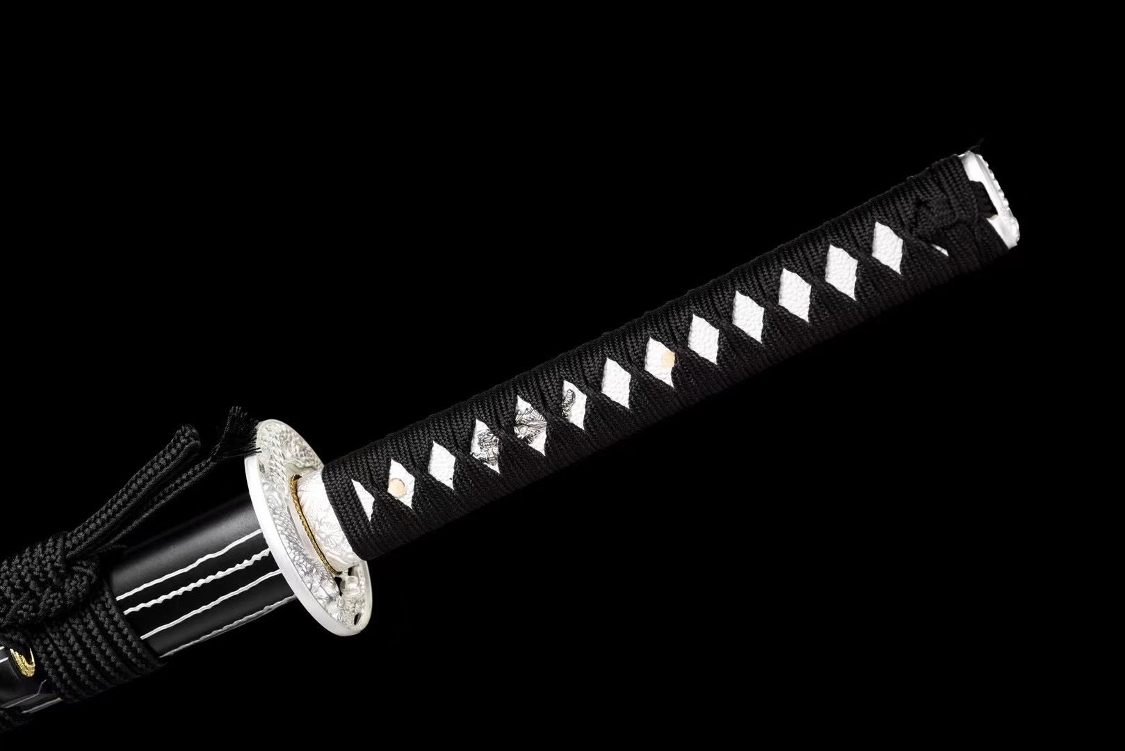 La lame en acier Damas noir révèle des motifs ondulants qui rappellent les coulées de lave figées dans l’obsidienne. Le bo-hi creuse une rainure élégante qui allège la lame tout en produisant un sifflement caractéristique lors des mouvements. La tsuba ronde en alliage argenté contraste magnifiquement avec la lame sombre, tandis que le dragon gravé symbolise la force primordiale qui sommeille dans les profondeurs volcaniques. Le manche présente une samegawa blanche authentique recouverte d’un tressage noir en losanges, créant un équilibre visuel saisissant. Les menuki représentent des dragons argentés qui semblent émerger des profondeurs, tandis que les fuchi et kashira ornés de fleurs gravées apportent une touche de raffinement. Le fourreau laqué noir zébré de traits blancs évoque les stries naturelles de l’obsidienne polie, complété par un sageo noir qui unifie l’ensemble.