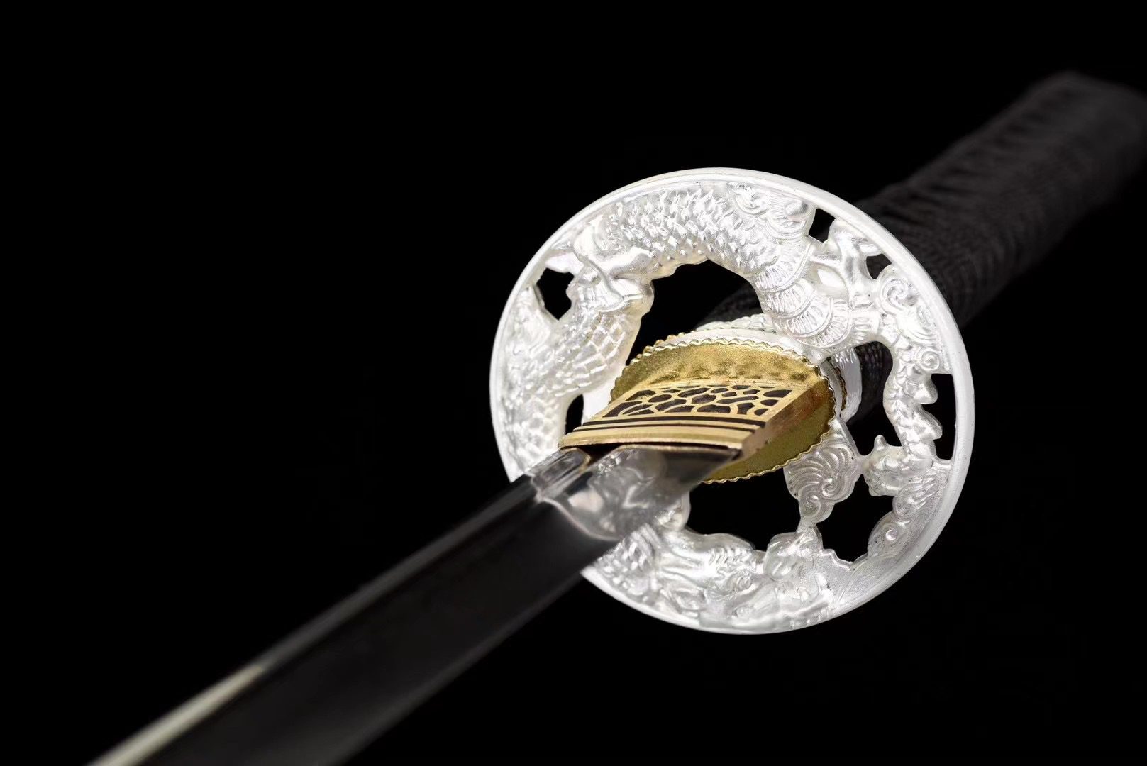 - Garde (Tsuba 鍔) : ronde en alliage argenté, ornée d’un dragon gravé.