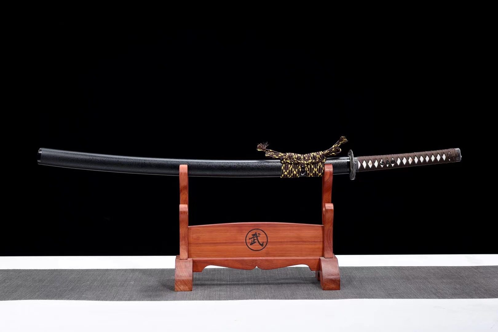 La lame en acier T10 révèle un hamon gunome midare authentique, obtenu par trempe différentielle, qui dessine des vagues irrégulières le long du tranchant comme les contours d’une chaîne montagneuse. Le bo-hi creuse une rainure élégante qui allège la lame tout en préservant sa robustesse. La tsuba ronde en alliage noir s’harmonise parfaitement avec les fuchi et kashira sculptés dans le même matériau, créant un ensemble cohérent et raffiné. Le manche combine la texture noble de la fausse peau de raie blanche avec un tressage marron en losanges, tandis que les menuki représentent des dragons noirs qui semblent s’élancer vers les cieux. L’habaki en laiton doré, orné d’un kamon traditionnel, contraste subtilement avec la sobriété générale. Le fourreau en bois laqué noir granuleux évoque la texture rugueuse de la roche volcanique, complété par un sageo aux tons marron et jaune qui rappellent les couleurs automnales des forêts de montagne.