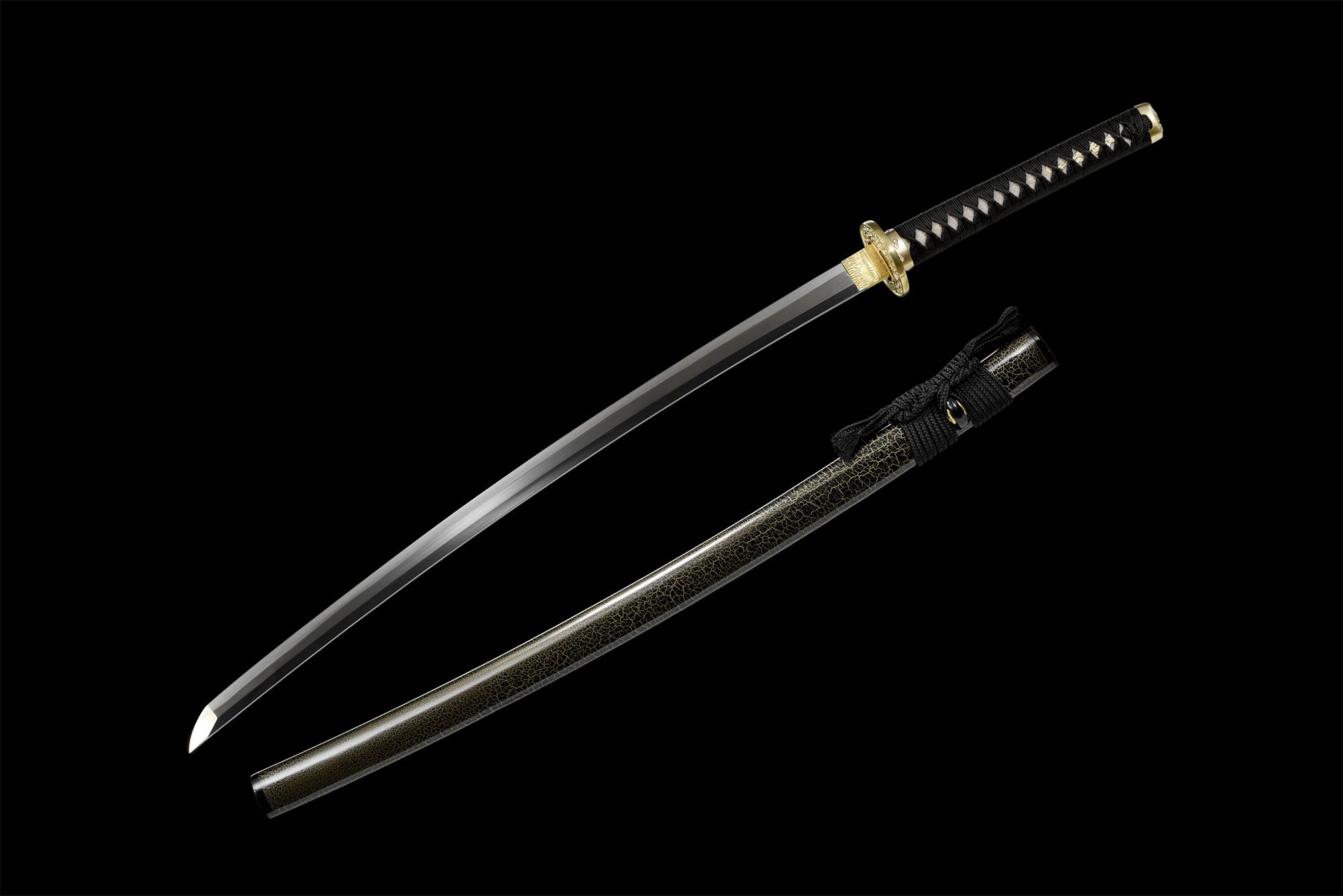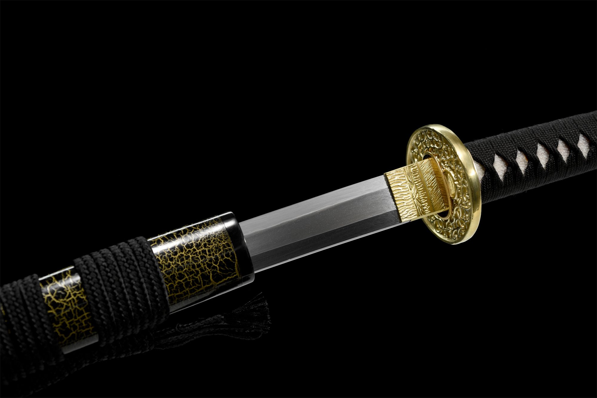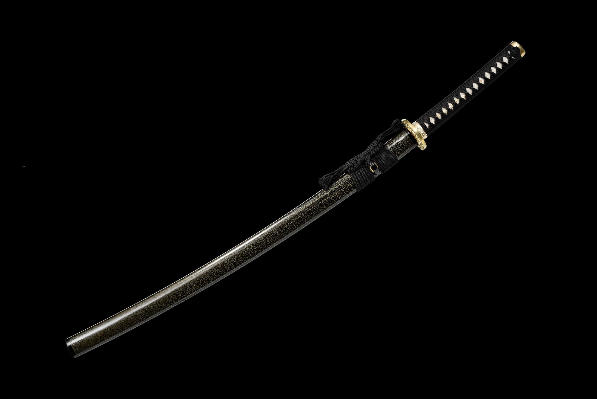 La lame en acier T10 révèle un hamon Suguba authentique, cette ligne de trempe droite qui témoigne du savoir-faire traditionnel japonais. Par ailleurs, la tsuba arrondie en laiton présente un motif de dentelle évoquant les vagues océaniques, créant un contraste poétique avec la symbolique terrestre du félin. Le manche combine la peau de raie authentique avec un tressage noir en losange, tandis que les menuki dorés représentent des dragons qui complètent l’iconographie mystique. Enfin, le fourreau noir laqué se pare d’un motif de félin doré et le koiguchi en corne véritable ajoute une note d’authenticité traditionnelle.