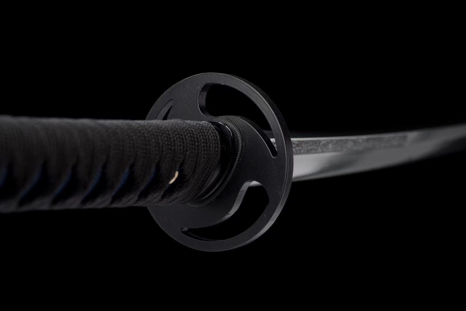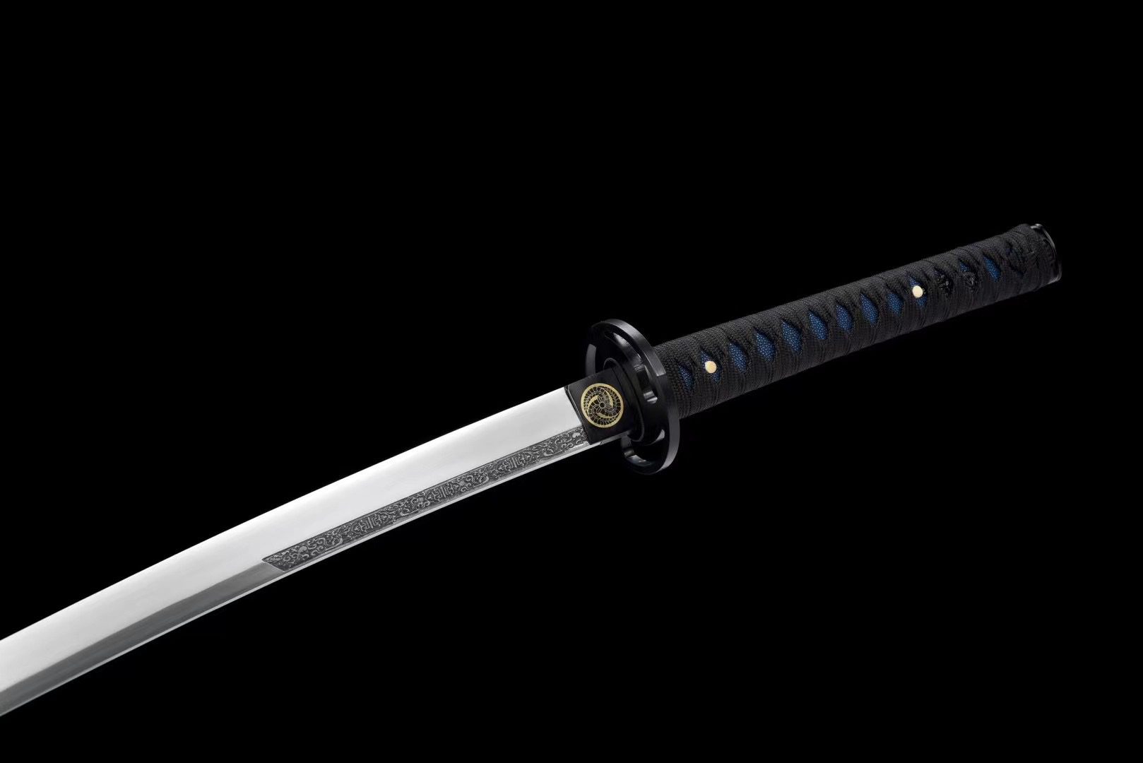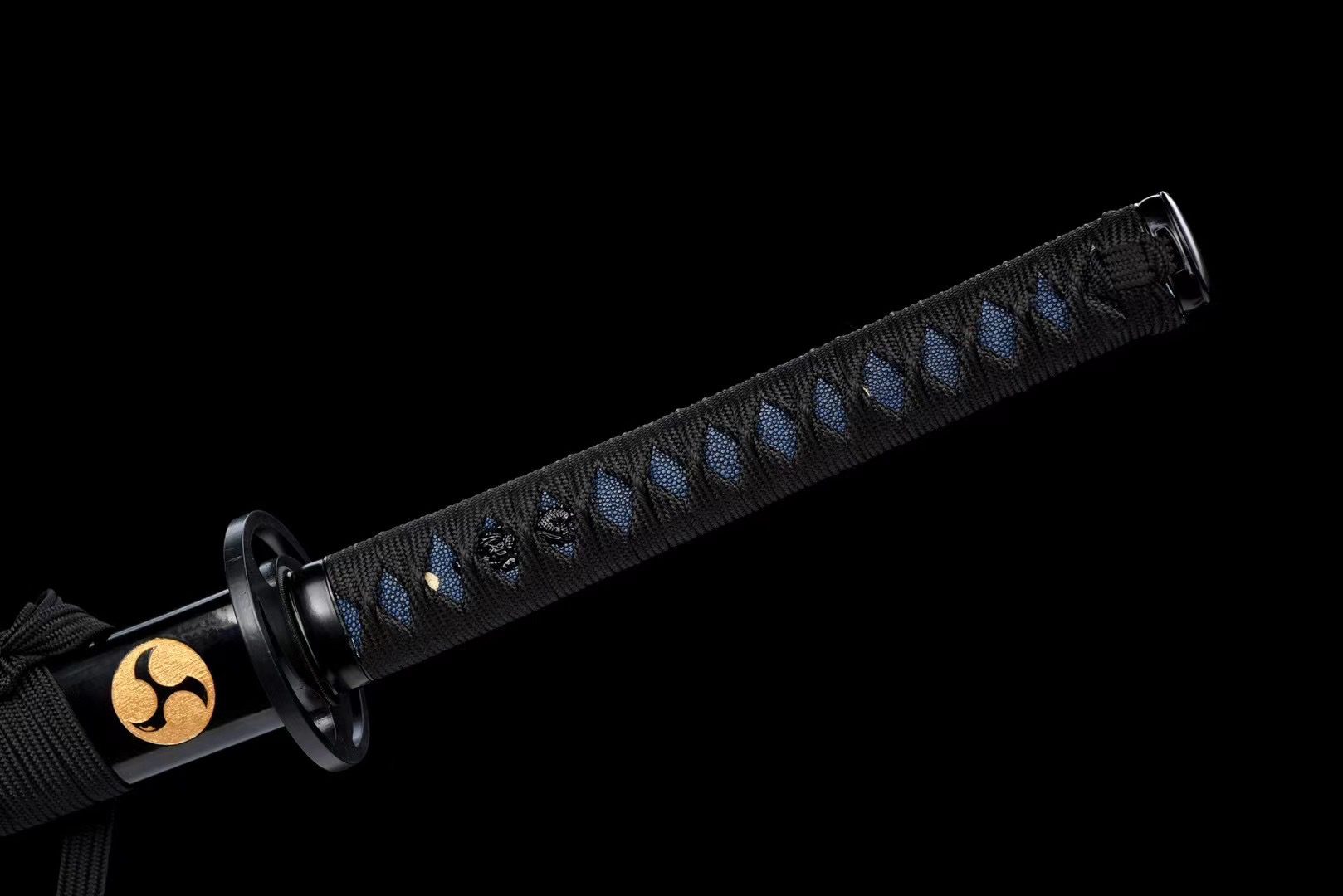 La lame en acier T10 présente une finition naturelle qui révèle la beauté brute du métal forgé, tandis que la garde (tsuba) ronde en alliage noir évoque une forme de shuriken. Le manche (tsuka) associe harmonieusement la fausse peau de raie bleue nuit au tressage noir (tsuka-ito) en motif losange, offrant une prise ferme et élégante. Les menuki représentent un dragon noir, symbole de puissance et de sagesse, tandis que les fuchi et kashira en alliage noir complètent l’ensemble avec leur finition lisse et raffinée. L’habaki noir porte lui aussi un kamon tournoyant évoquant le shuriken. Le fourreau (saya) en bois laqué noir s’orne de kamon en forme de shuriken noirs, et ses extrémités (kojiri et koiguchi) reprennent cette teinte profonde, accompagnées d’un sageo noir discret.