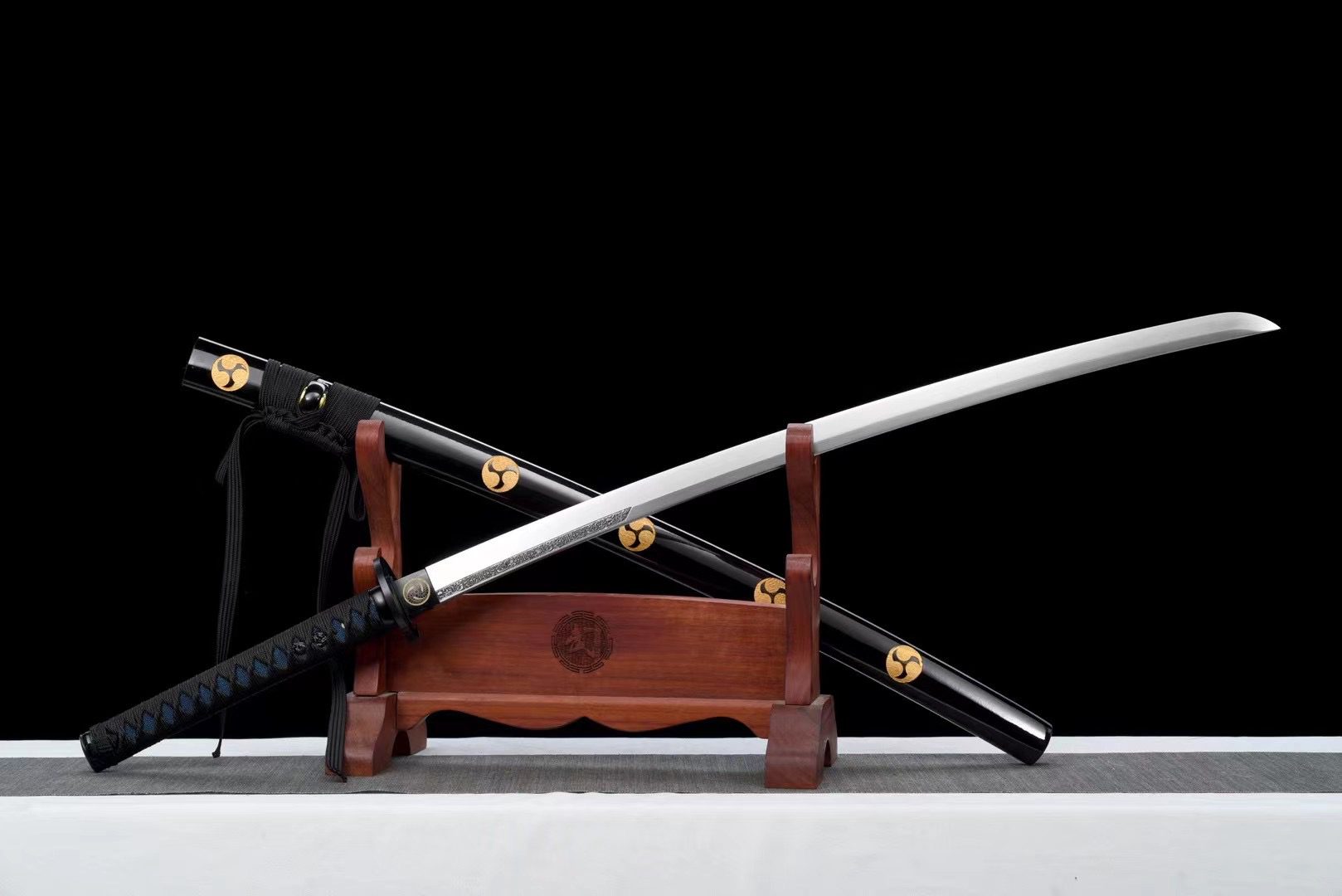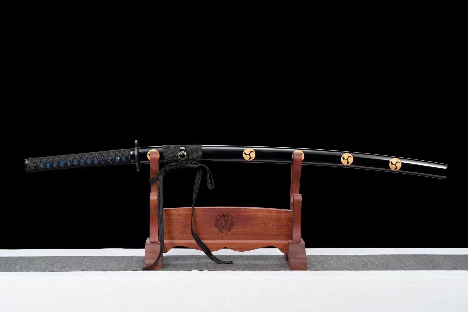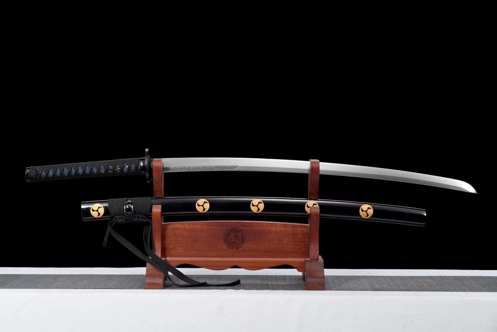 La lame en acier T10 présente une finition naturelle qui révèle la beauté brute du métal forgé, tandis que la garde (tsuba) ronde en alliage noir évoque une forme de shuriken. Le manche (tsuka) associe harmonieusement la fausse peau de raie bleue nuit au tressage noir (tsuka-ito) en motif losange, offrant une prise ferme et élégante. Les menuki représentent un dragon noir, symbole de puissance et de sagesse, tandis que les fuchi et kashira en alliage noir complètent l’ensemble avec leur finition lisse et raffinée. L’habaki noir porte lui aussi un kamon tournoyant évoquant le shuriken. Le fourreau (saya) en bois laqué noir s’orne de kamon en forme de shuriken noirs, et ses extrémités (kojiri et koiguchi) reprennent cette teinte profonde, accompagnées d’un sageo noir discret.