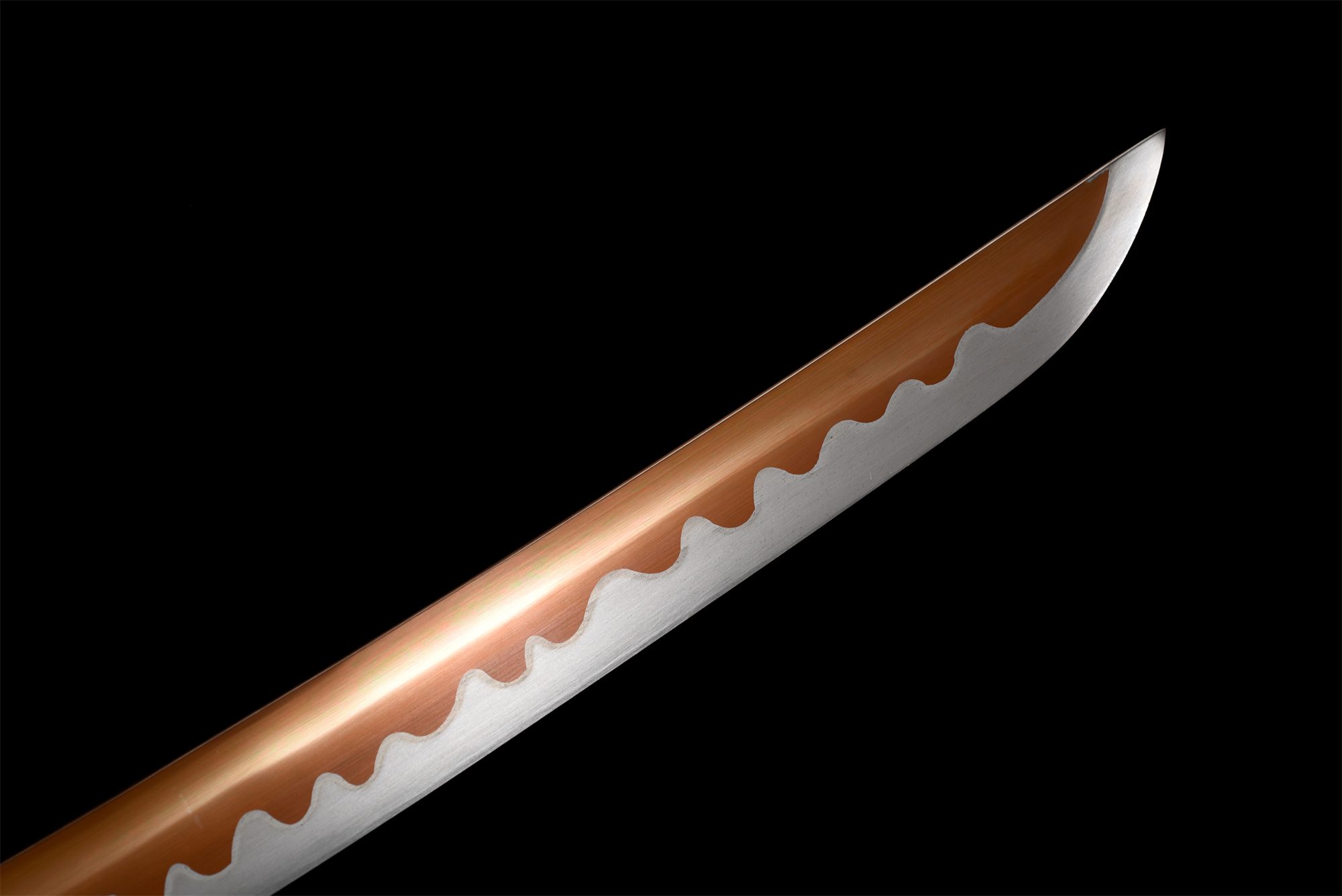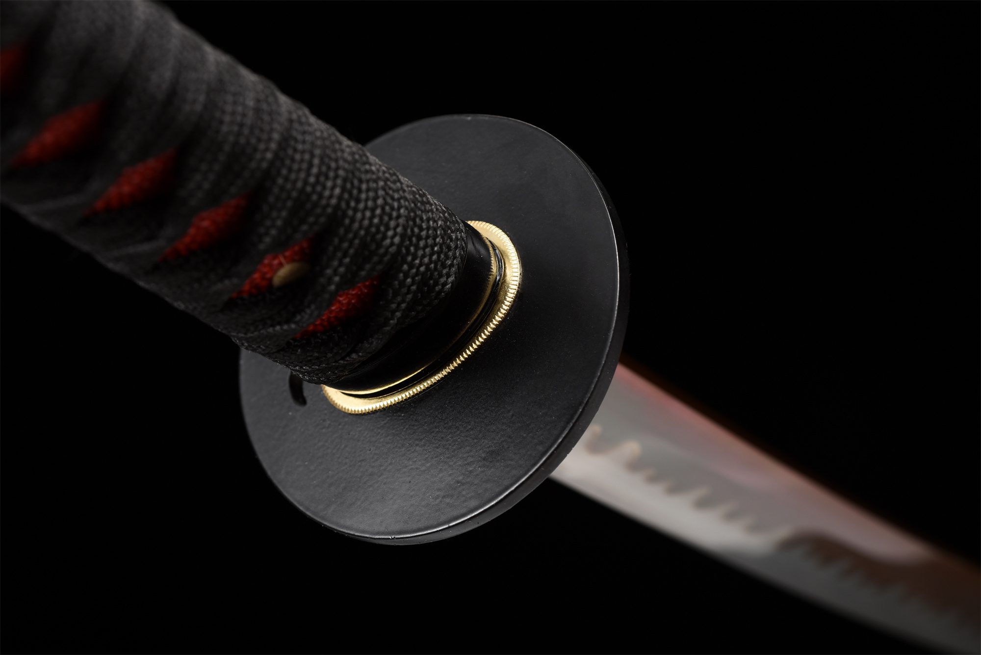 La lame en acier au manganèse présente des teintes orange et acier qui se marient harmonieusement avec le hamon midare gunome, créant des vagues irrégulières le long du tranchant. La tsuba ronde noire offre une protection élégante tandis que l’habaki en laiton gravé de motifs floraux fait écho au thème du cerisier. Le manche révèle une fausse peau de raie rouge recouverte d’un tressage noir en losanges (tsuka-ito), orné de menuki représentant des dragons noirs ciselés. Les fuchi et kashira en alliage noir poli complètent cette harmonie sombre. Le fourreau (saya) en bois laqué rose et noir avec effet brossé capture parfaitement l’essence du cerisier noir, rehaussé par des extrémités noires et un sageo assorti.