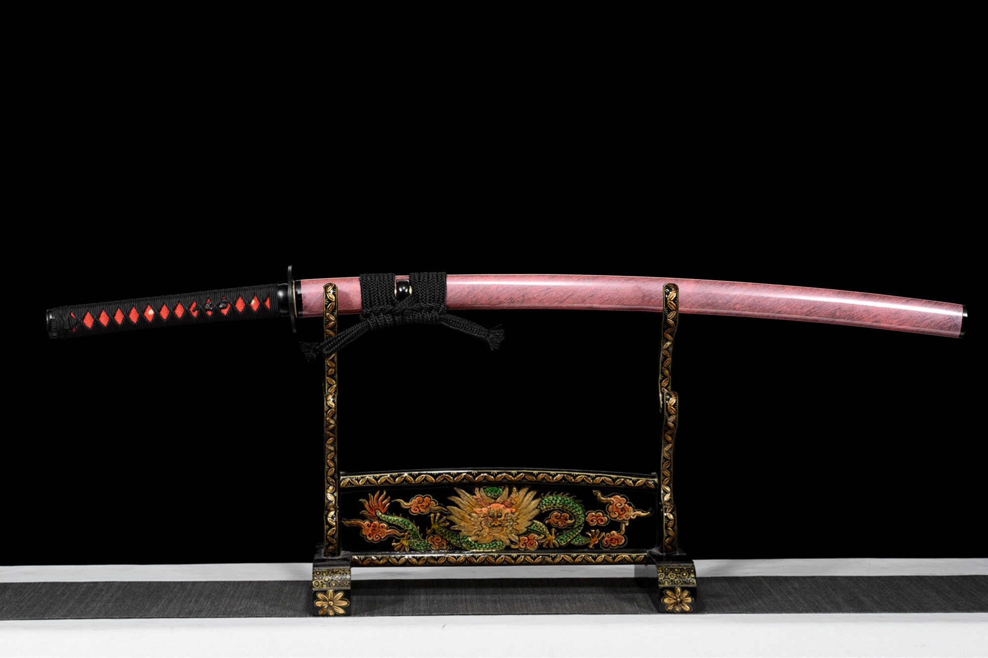 - Fourreau (Saya 鞘) : bois laqué en rose et noir avec effet brossé, extrémités noires (Kojiri et Koiguchi).