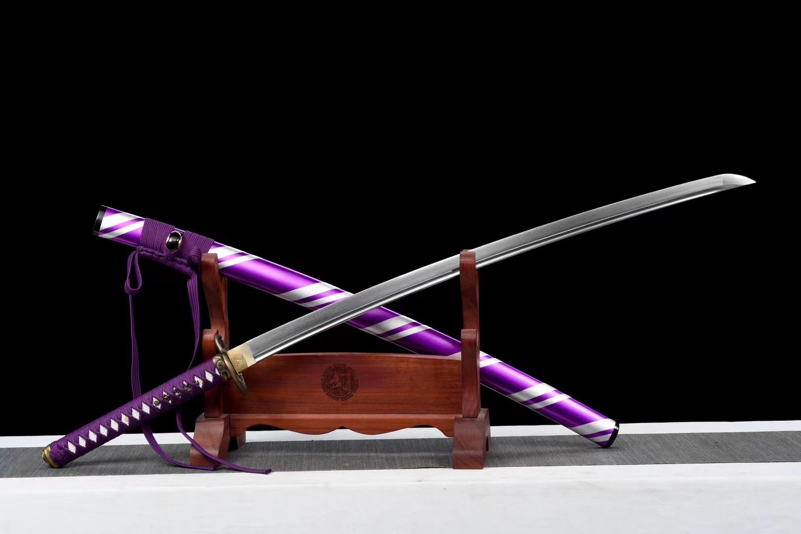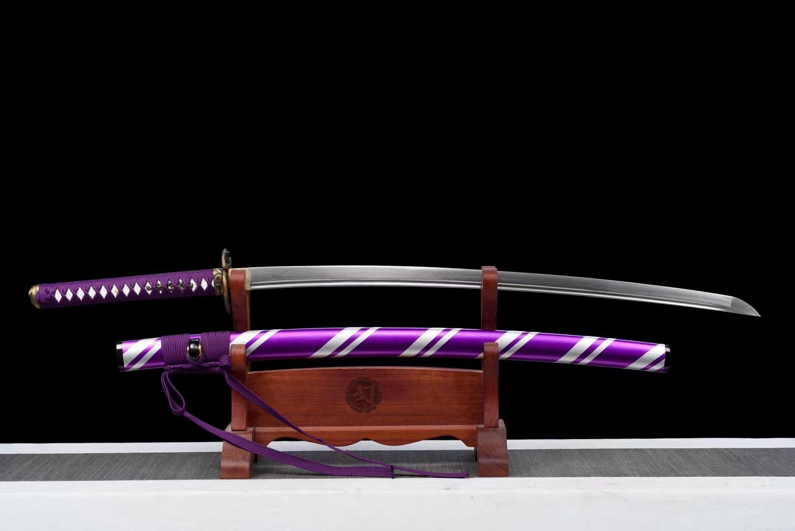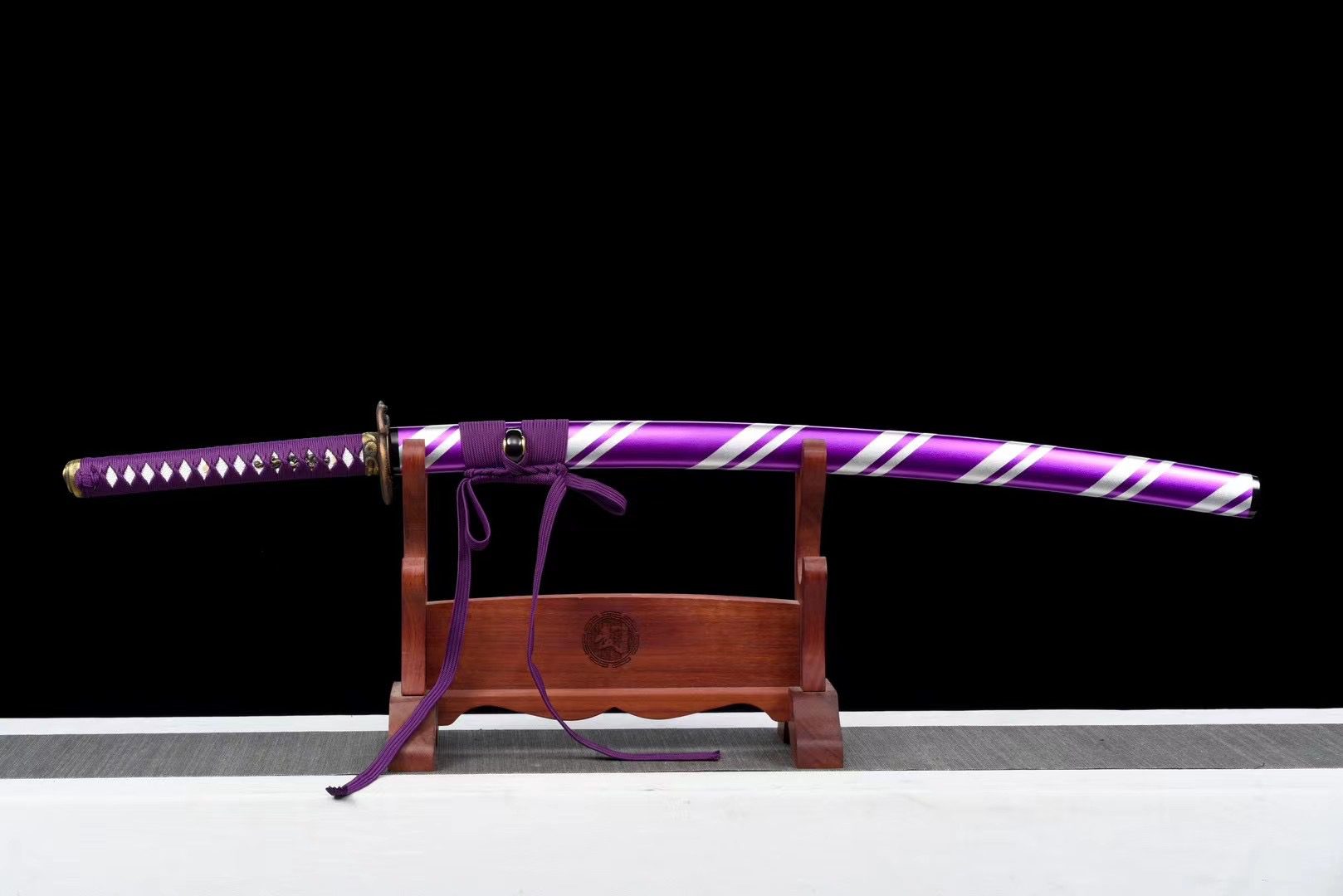 - Fourreau (Saya 鞘) : bois laqué alternant des lignes blanches et violettes, avec Kojiri et Koiguchi noirs.