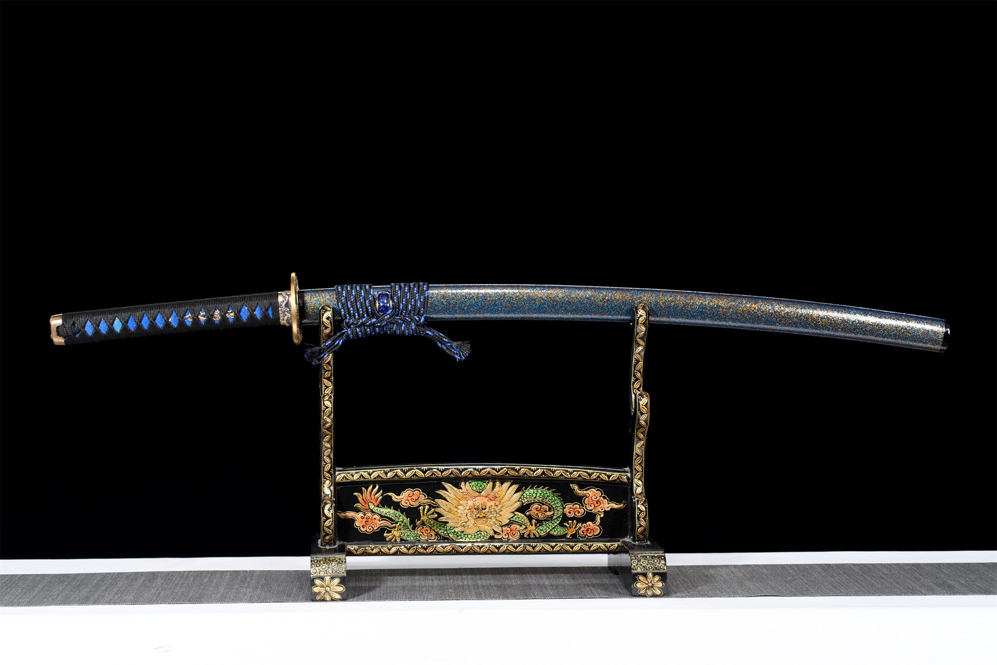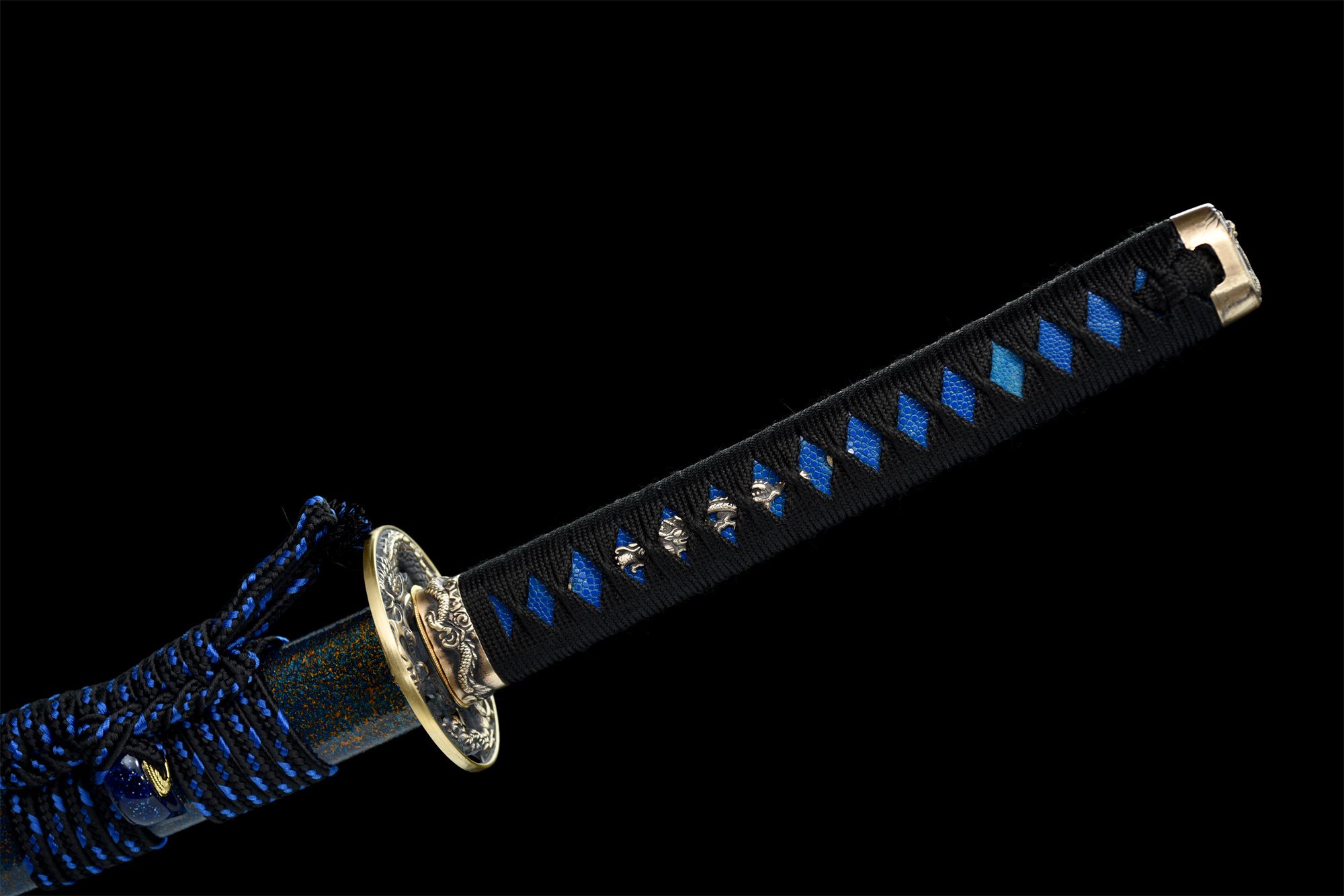 La lame en acier T10 révèle un hamon midare authentique aux flammes dansantes, créé par la trempe différentielle traditionnelle qui confère à l’acier sa résistance légendaire. La tsuba en laiton arrondie présente un dragon ciselé avec finesse, symbole de puissance et de sagesse orientale. Le manche combine harmonieusement la peau de raie authentique et le bois dur, enveloppés d’un tressage noir en motifs losange qui assure une prise ferme et élégante. Les menuki dorés représentent des dragons, tandis que le fuchi reprend ce motif draconique et que le kashira arbore des symboles de vagues et de vent. Le fourreau bleu aux reflets granuleux orange évoque les teintes changeantes du ciel crépusculaire, complété par un koiguchi en corne véritable et un sageo bicolore bleu et noir.
