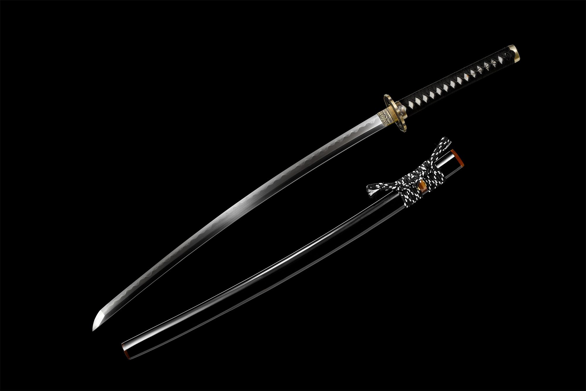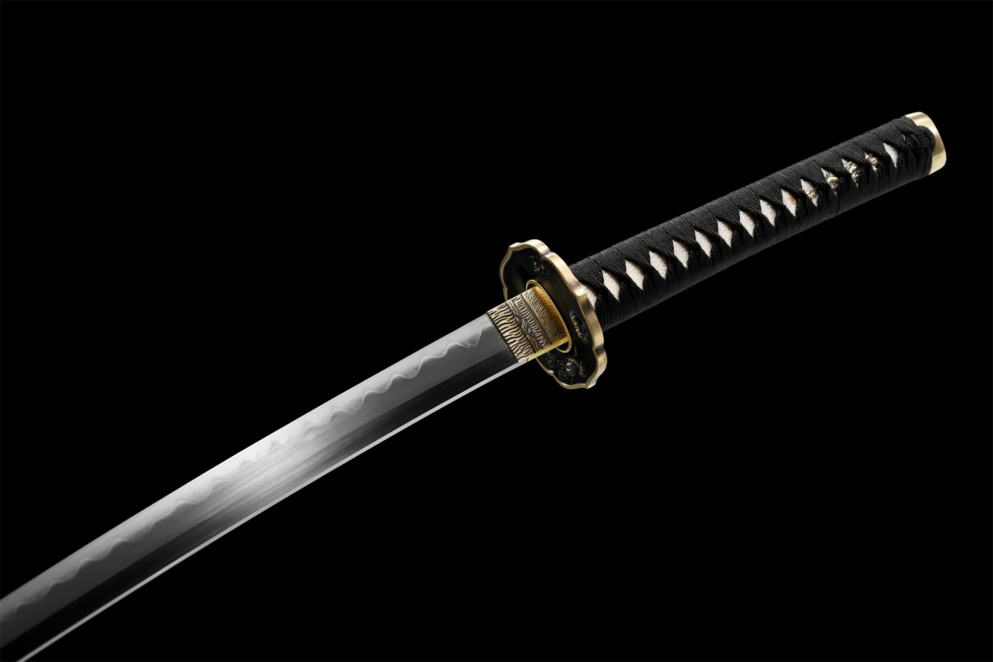 La lame en acier T10 arbore un magnifique hamon Notare dont les ondulations rappellent les collines baignées de clair de lune. Cette trempe différentielle crée des vagues harmonieuses le long du tranchant, témoignant de la maîtrise technique de nos forgerons. La tsuba en forme de lotus, réalisée en cuivre doré et noir, présente un dragon plongeant sous l’eau finement gravé. Le manche révèle une peau de raie authentique recouverte d’un tressage noir en motif losange, tandis que les menuki représentent des dragons argentés qui semblent danser sous la lune. Le fuchi orné d’un dragon enroulé et le kashira sculpté en tête de dragon complètent cette thématique draconique. Le fourreau en bois laqué noir, rehaussé d’éléments en véritable corne au koiguchi, évoque la profondeur de la nuit étoilée.
