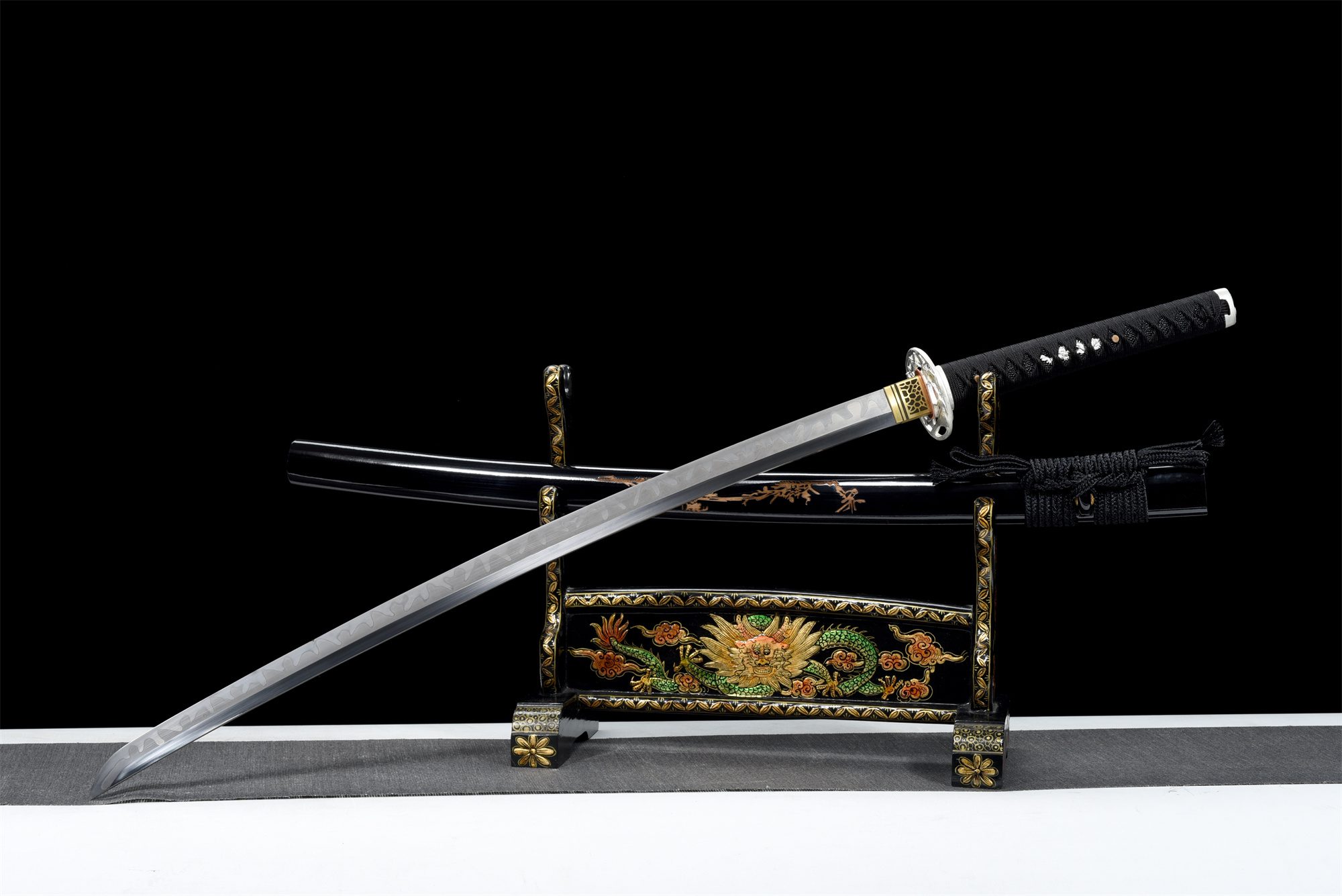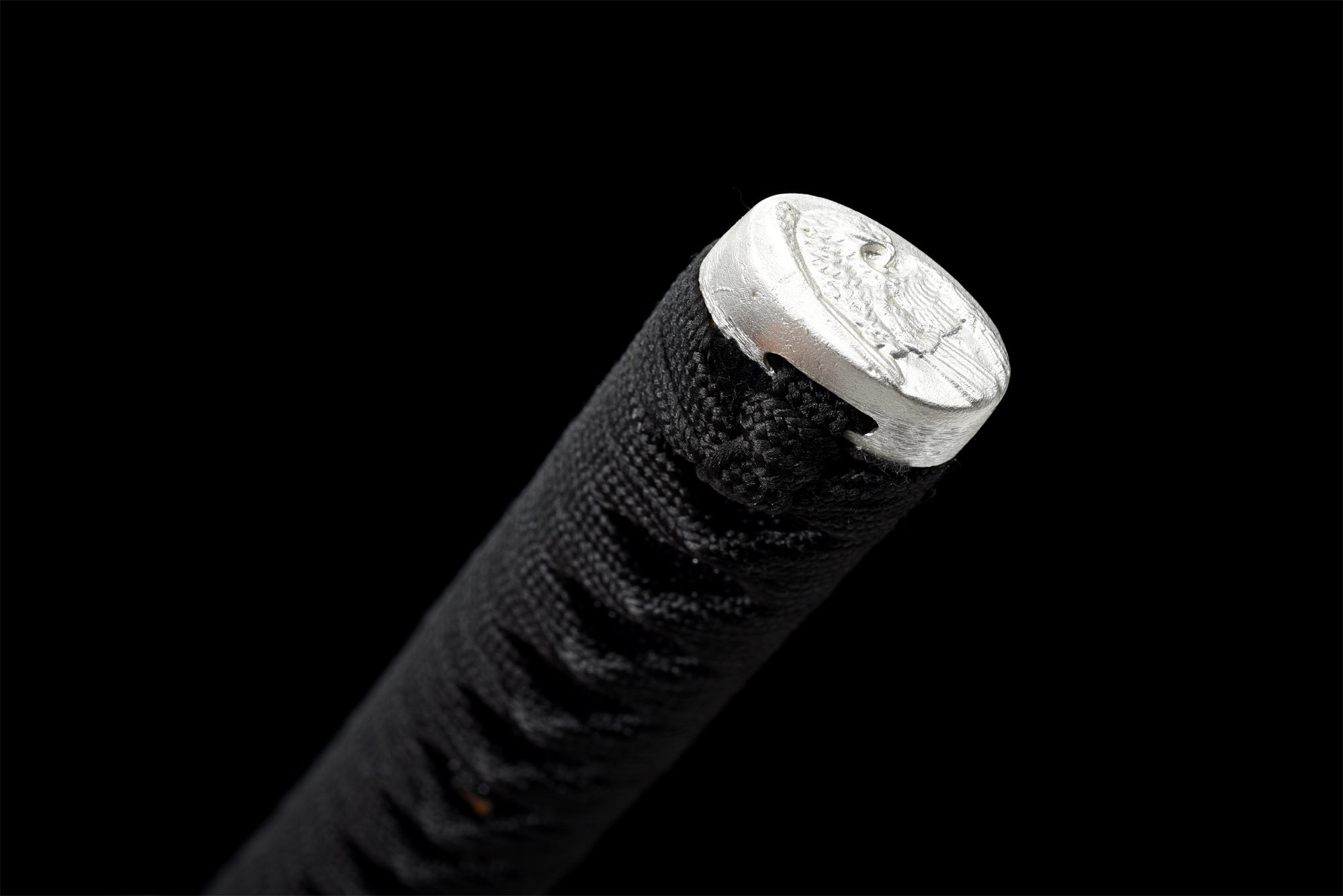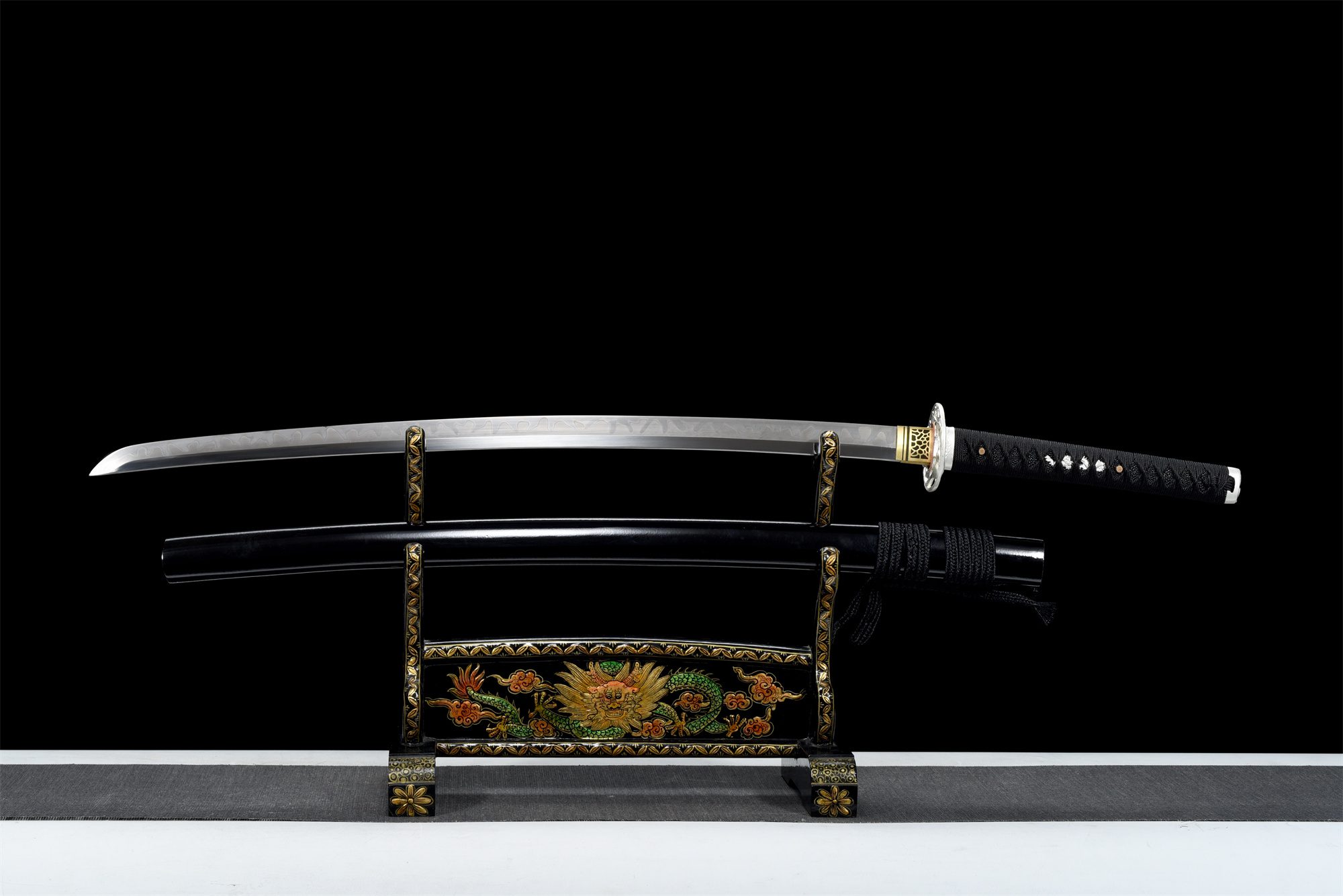 La lame en acier T10 présente une couleur acier naturel qui révèle un hamon subtil, témoignage de la trempe différentielle traditionnelle. La tsuba arrondie en alliage plaqué argent arbore un motif d’arbre gravé en creux, symbolisant la croissance et la persévérance à travers les saisons. Le manche combine harmonieusement le bois massif et la fausse peau de raie noire, tandis que le tressage noir en motif losange du tsuka-ito assure une prise ferme et élégante. Les menuki représentent des dragons argentés finement ciselés, gardiens de la sagesse ancestrale, alors que le fuchi et le kashira coordonnés présentent des motifs floraux délicats sur fond argenté. L’habaki en laiton doré contraste avec ses motifs noirs, créant un jeu visuel saisissant. Le fourreau en bois massif laqué noir s’orne d’une peinture de bambou, évoquant la flexibilité et la résilience face aux épreuves.