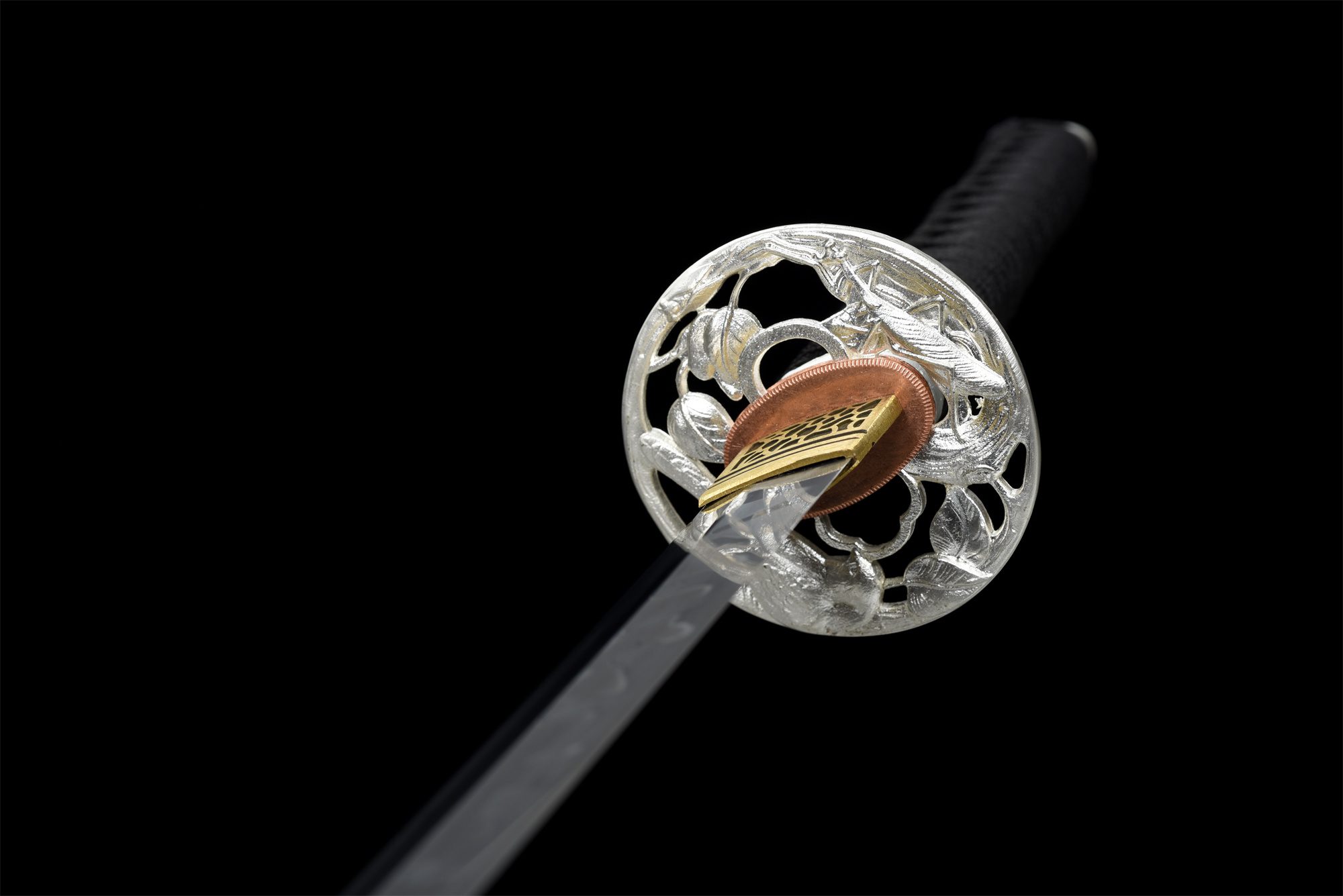 - Garde (Tsuba 鍔) : Forme arrondie en alliage, creusée d’un motif d’arbre et plaquée argent.