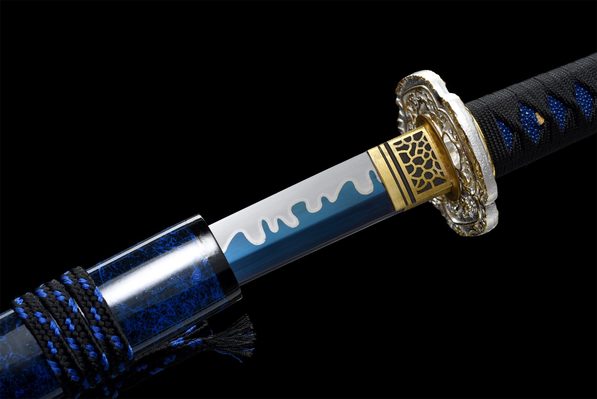 - Fourreau (Saya 鞘) : Fourreau en bois massif laqué noir et bleu.